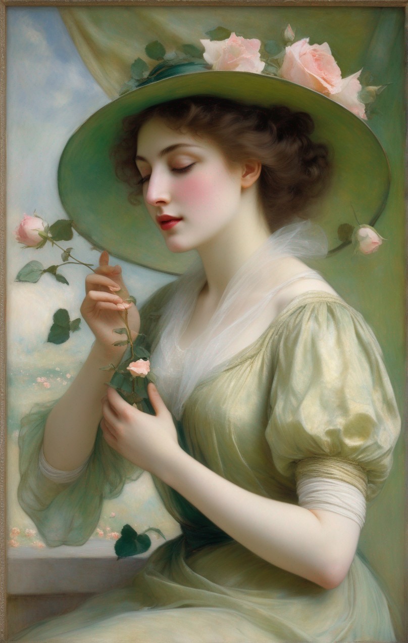An artwork featuring a woman with a hat adorned with roses, exuding a serene and romantic aura against a blue backdrop.