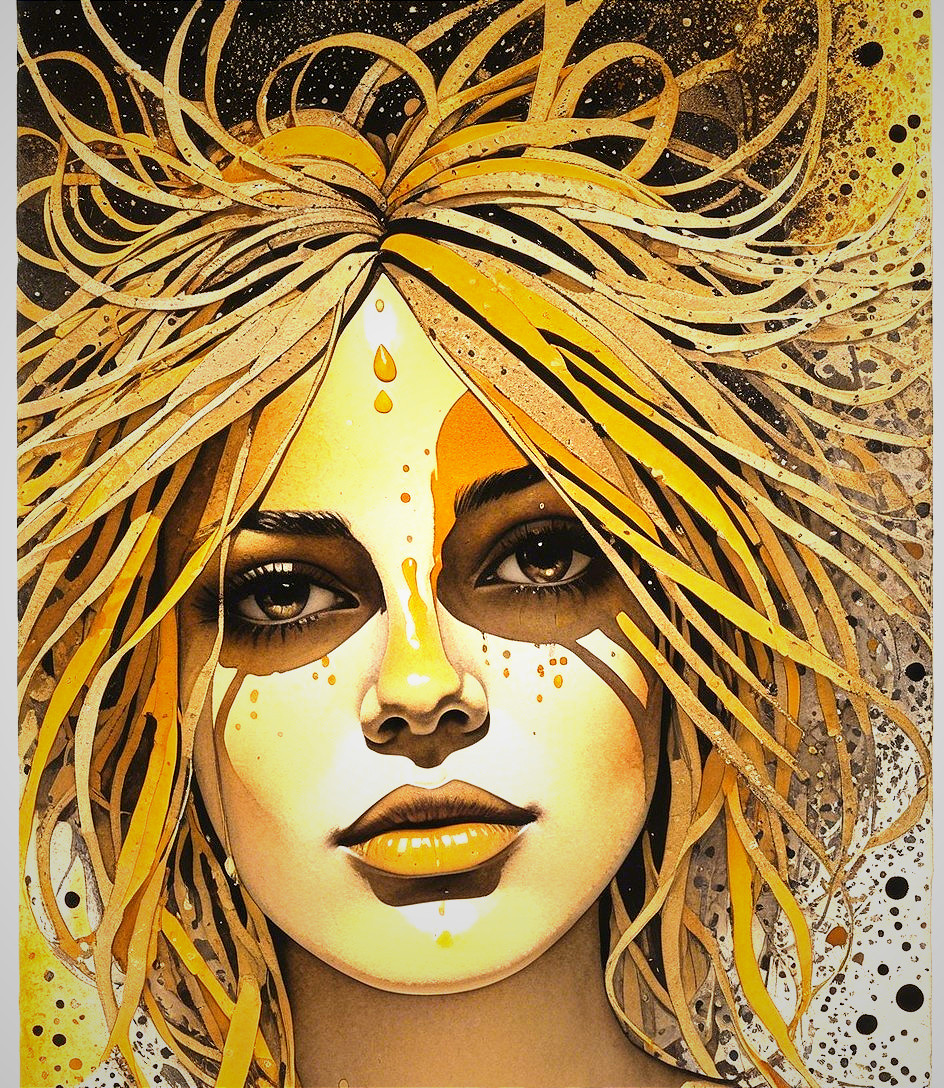Prompt: Wet on wet painting by saul steinberg and Hugo Pratt and Ho Baron, female headshot, beautiful dark fantasy, tonalism, unparalleled detail, paper fibers, splash ink technique in style of Marc Allante, colorful yam, warm coloring, dark-yellow, metallic-honey, light-brown, stippled shadow effects, visible textures creating a coherent line-artwork by david graeme Baker and Marc Allante, stylized art merged with contouring lineage, crisp quality, liminal, sculpted, incredibly detailed, parallax occlusion, soft rounded edges, Pencil and Pastels, ink and alcohol, aquatint merged with aquarelle extrusion, stylized facial features, baked-milk-tones contoured by black ink, micro-pen lines, american gothic, triadic color scheme of light-yellow, burnt orange and sienna in intricate patterns and textures, ray-traced shadows 1.2, custom_loss:edge, fusion of geometrical styles with elements of foampunk, whimsical traumacore with hatching details and ethereal atmosphere, juminocore merged with comic book art by Patrick Nagel, only curves, dynamic lighting 1.7, softened lighting, great depth and scale in brightened tones, american gothic 1.3, gradient inking watercolors, asymmentrical geometric lines, line-art, HDR, crisp quality, reminiscent of 1970s comic book art, brightness 1.9, plasticity 1.3, stylized linocut by Earl Moran and Jay Coby, parallax occlusion 1.3, sawtooth wave, lineage in hues, impossible light transitions, liminal, 3D effects, sharp focus, detailed linework, mystical female with grungy allure, rim lighting, rule of thirds, quilling, delicate coloring 1.3, sculpted, cel-shaded, watercolor and ink style, hdr, VFX-inspired, precise Gelsculpt 64K, novelty architecture, dethereal, chibli, ((layered paper texture, (vibrant hues, (softened yellows, light-brown, goldenrut-yellow), highly emotional), 3 layers of dof), 9:13, coherent line-art features), multi-layered eyes, serenity, joyful,