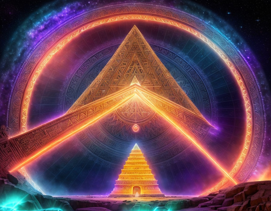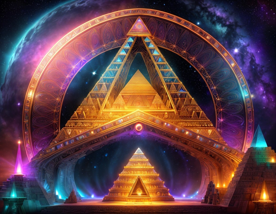 Meticulously detailed image of a hypnotic portal swirling with cosmic energy above an ancient extraterrestrial pyramid, with an intricately adorned altar at its peak. Above the altar emerges the radiant vibrant portal. Utilize depth of field to emphasize the intricate details of the portal and the complex geometric patterns on the pyramid. Capture the mysterious allure of this trans-dimensional gateway, where past and future converge, and the secrets of the universe unfold in a mesmerizing display of depth and wonder. Enveloped by a cosmic landscape of cloudy nebulas and stars. In the style of Cameron Gray