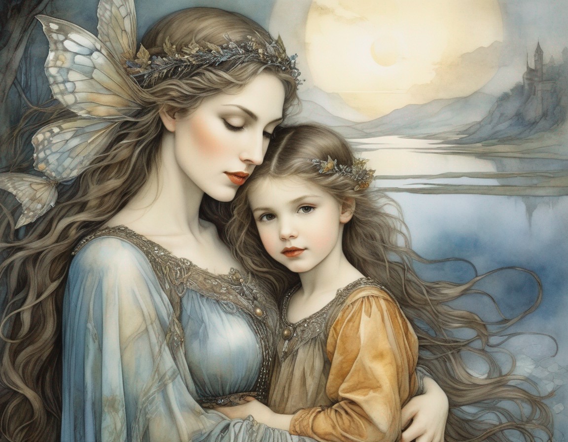 Prompt: Spirit nymph mother and child in the style of Sulamith Wulfing