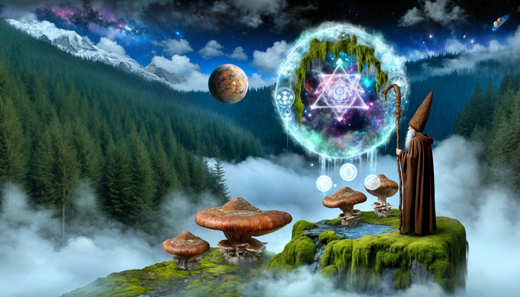 A wizard gestures towards an ethereal, glowing pyramid overlaying a real one under a starry sky.