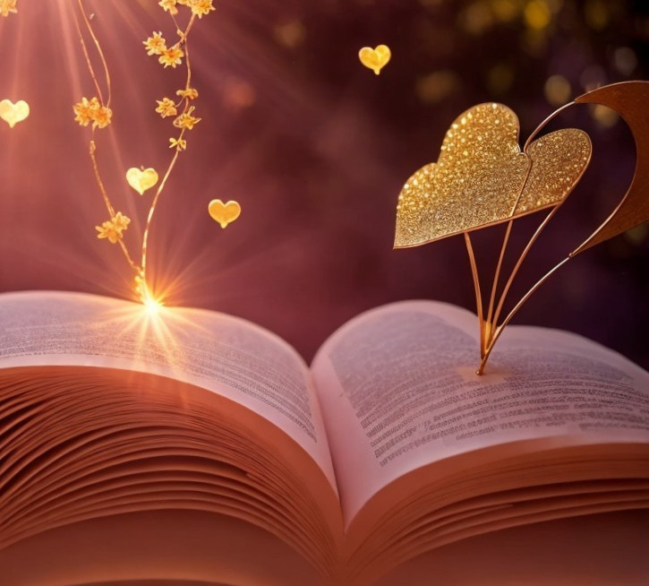 a fountain of hearts and love comes out of a open book, flowers float, golden stardust floats, morning sun shines through an open window in the background, romantic, mystical, masterpiece