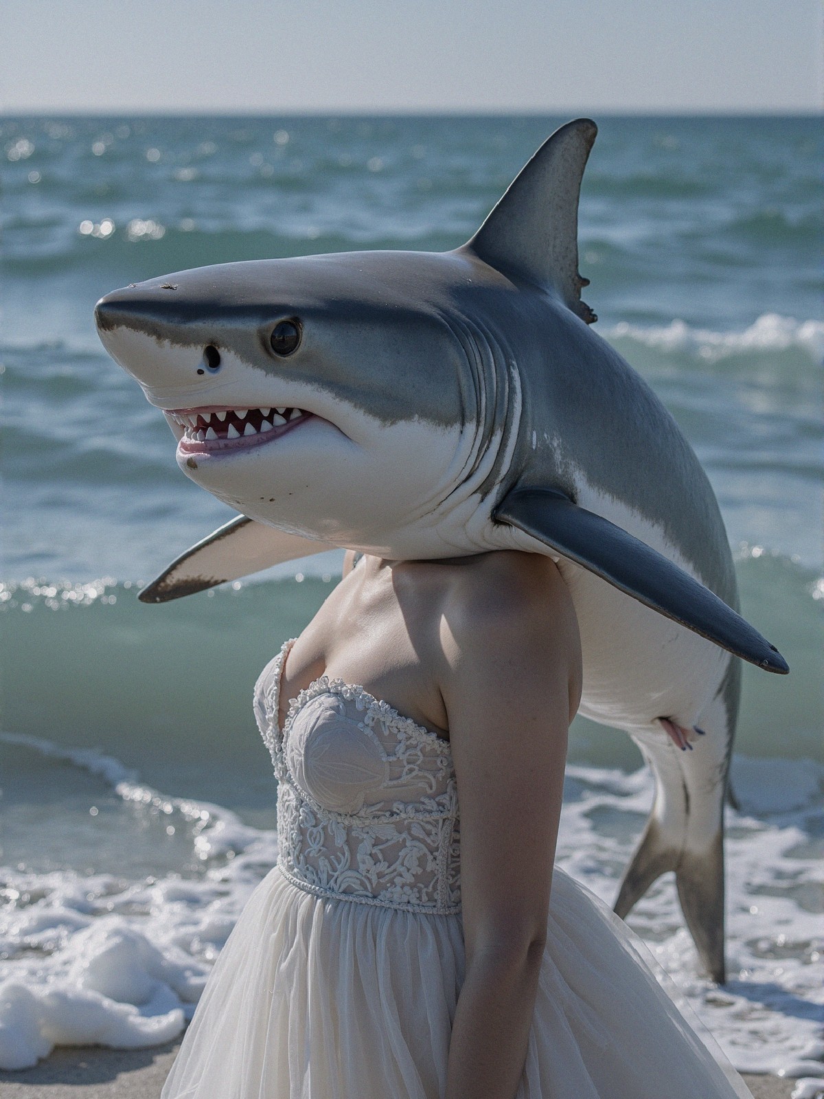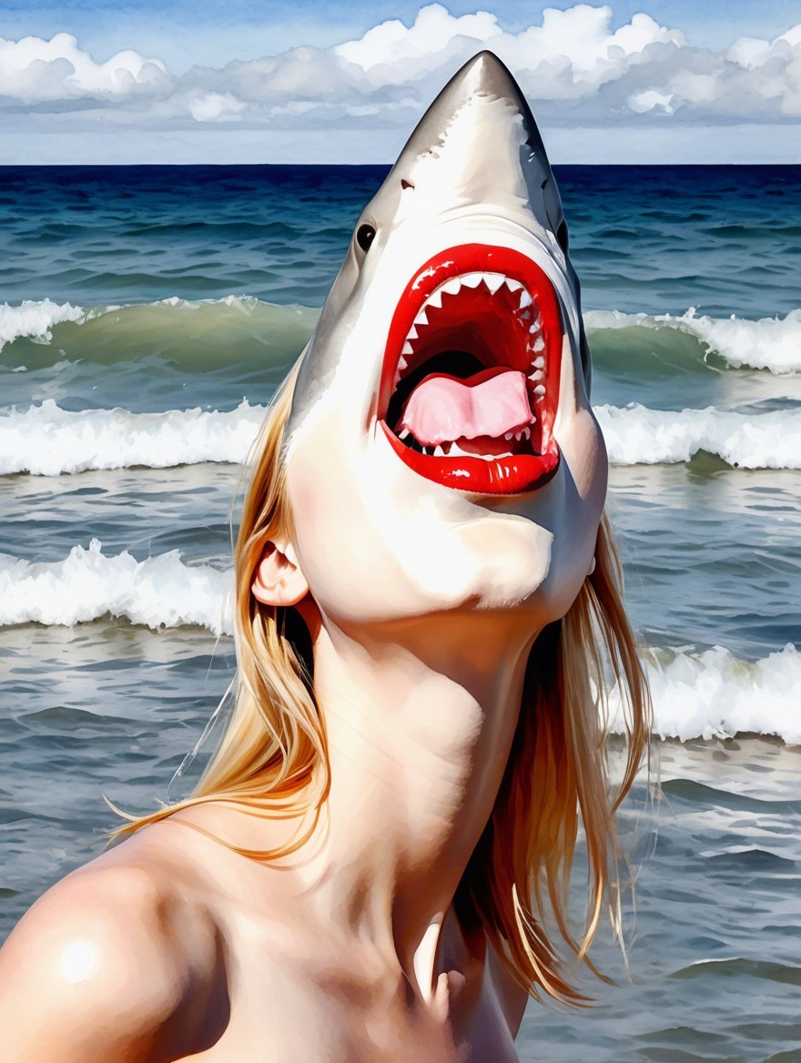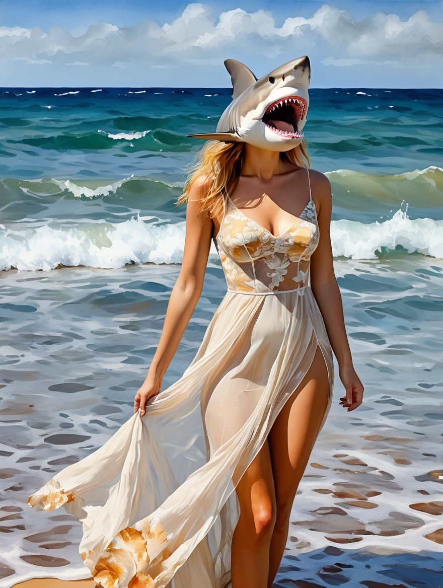 A woman in a white swimsuit playfully leans toward a large shark with an open mouth on a beach, blending fantasy and humor against a vibrant ocean backdrop under a blue sky.