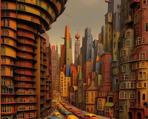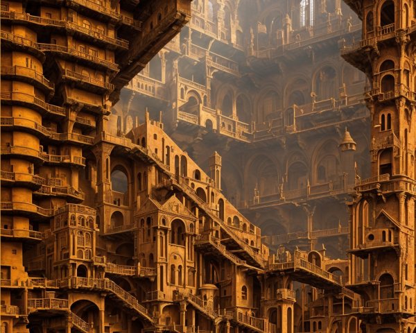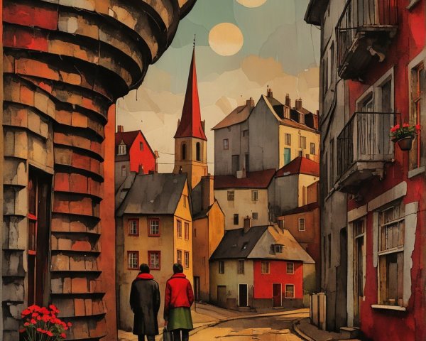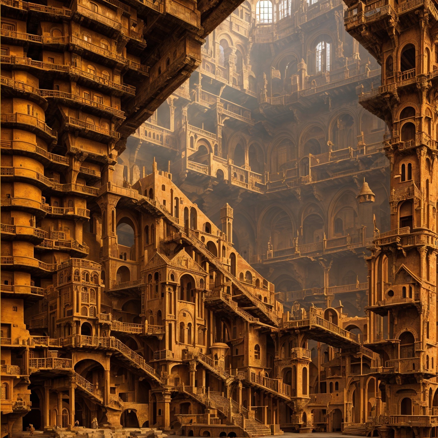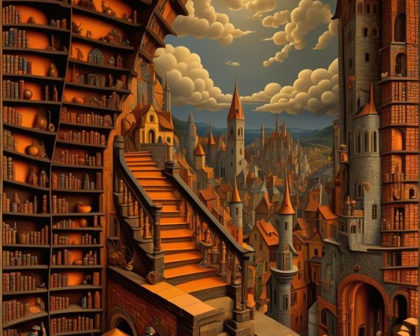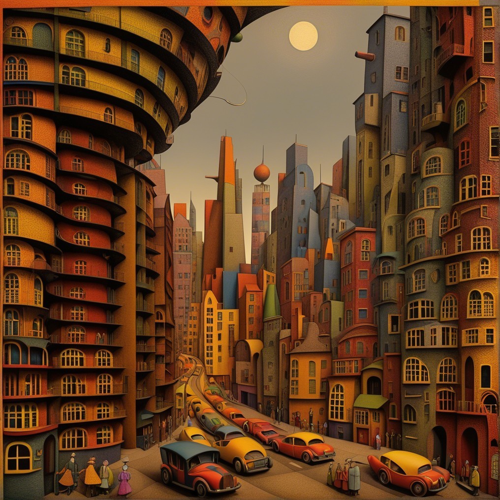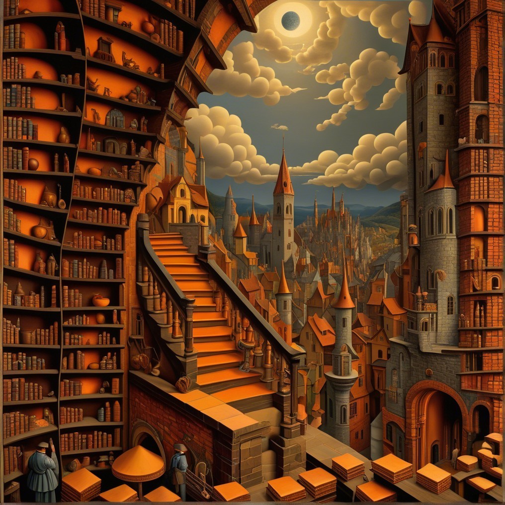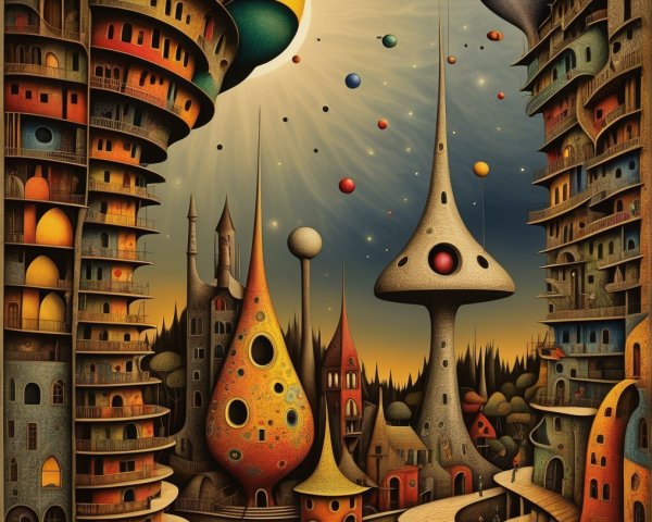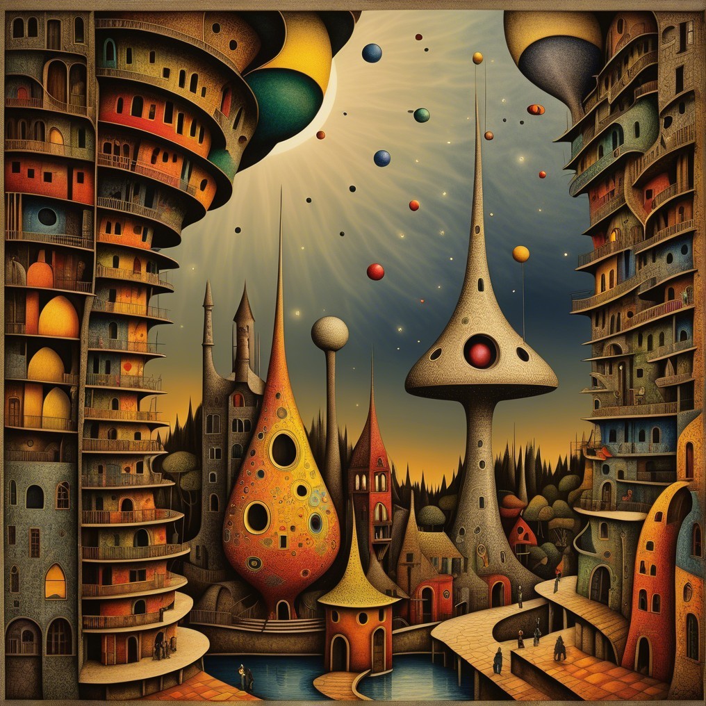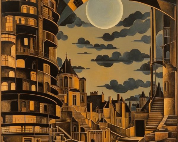 The artwork depicts a surreal, moody cityscape at night, featuring twisting staircases, unique architectural structures, and a large moon illuminating the clouds above, creating a dreamlike atmosphere.
