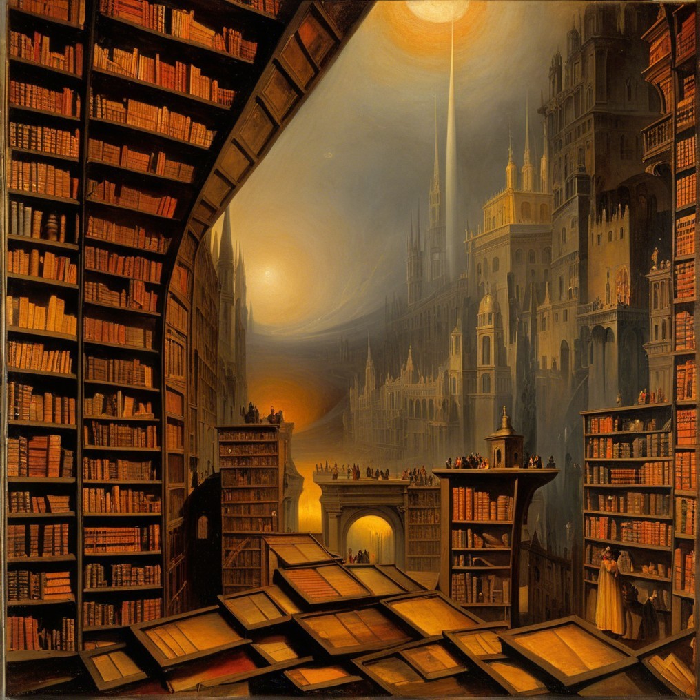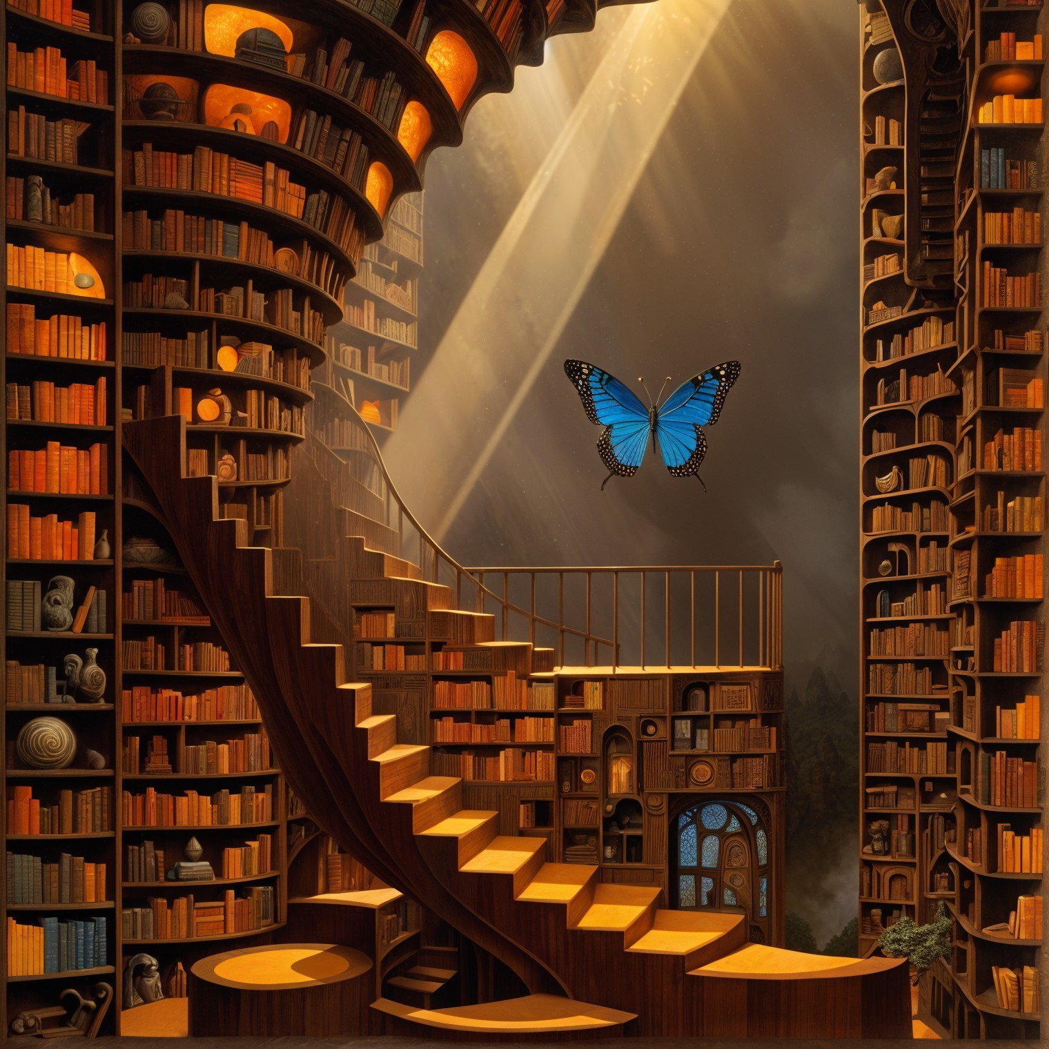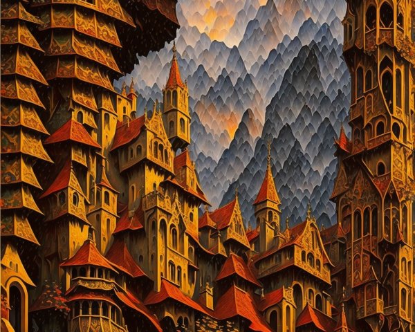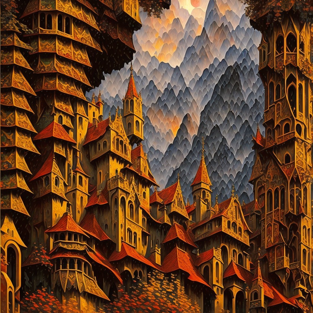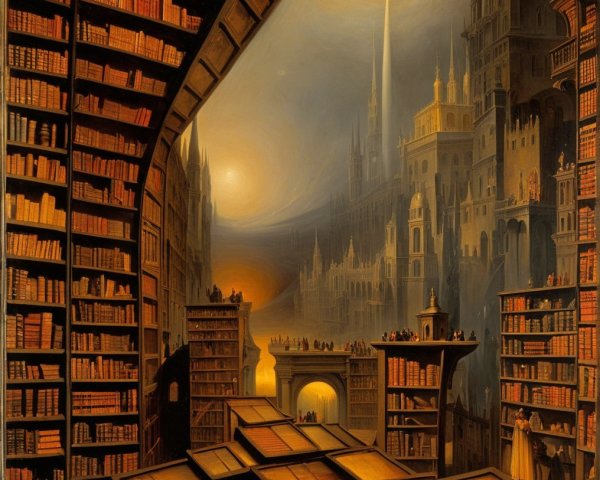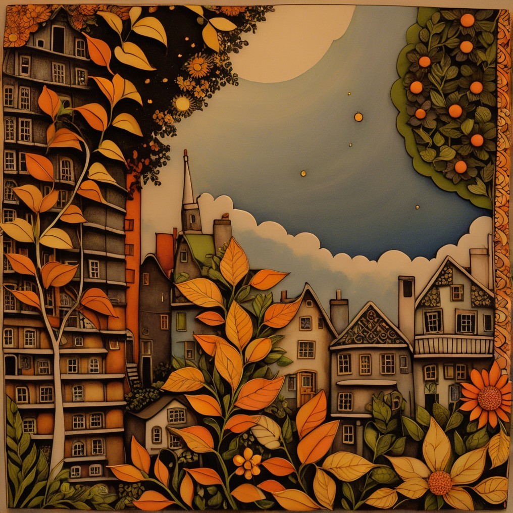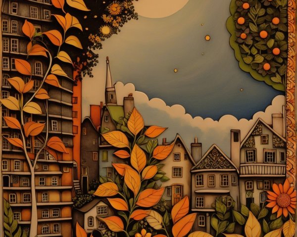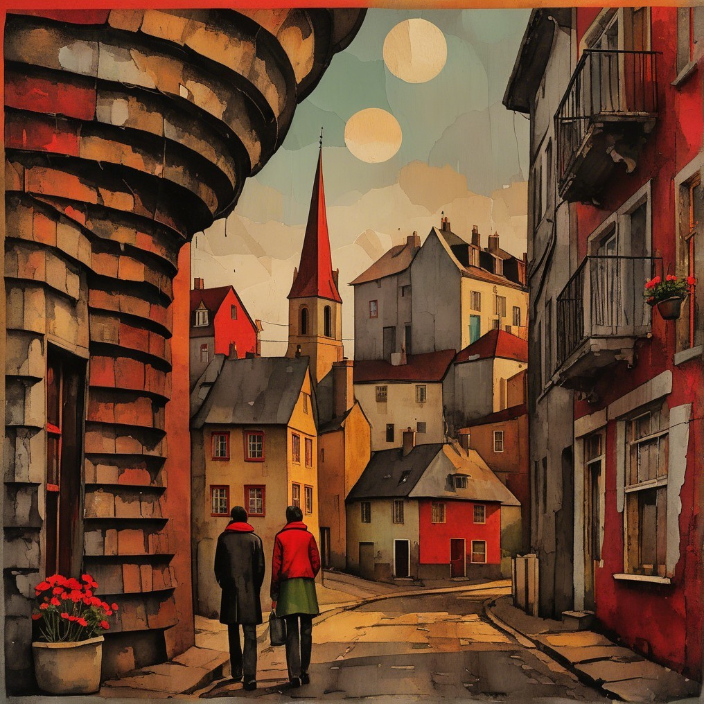 The artwork depicts a surreal, moody cityscape at night, featuring twisting staircases, unique architectural structures, and a large moon illuminating the clouds above, creating a dreamlike atmosphere.