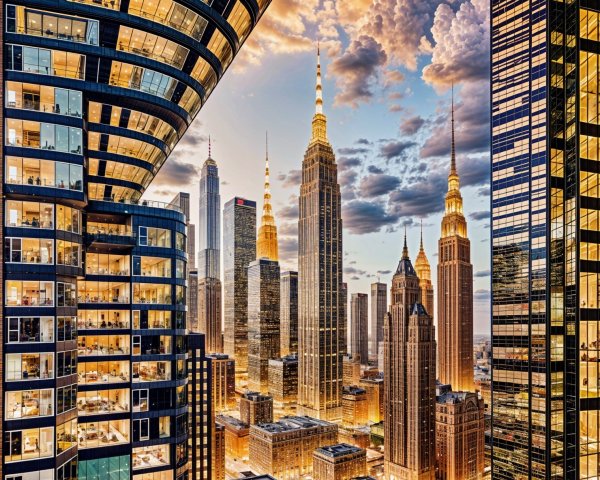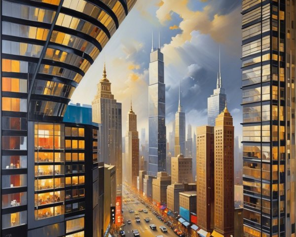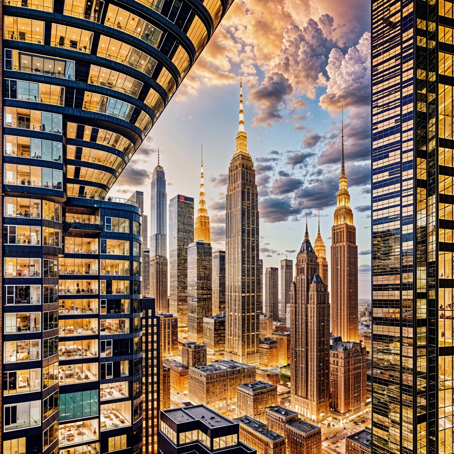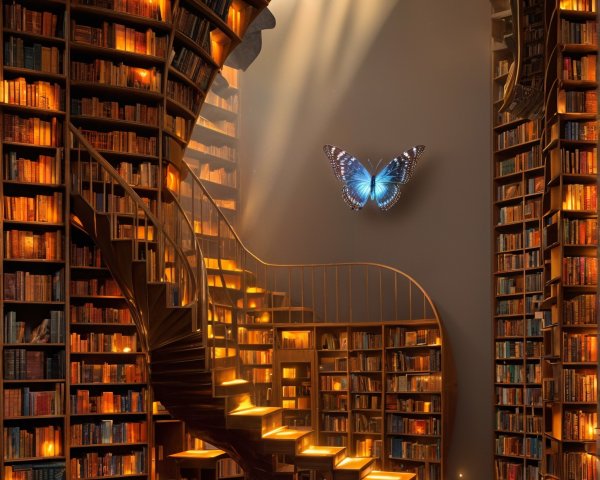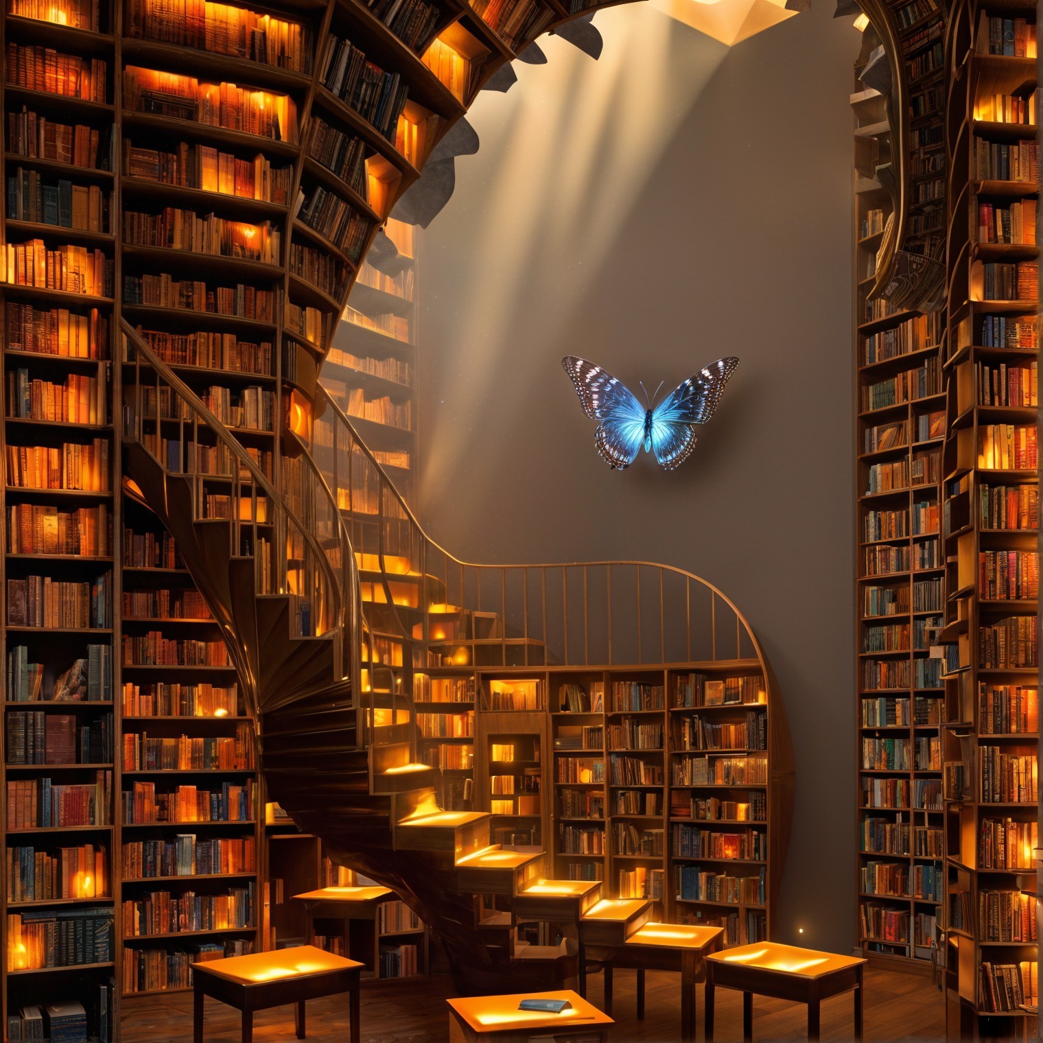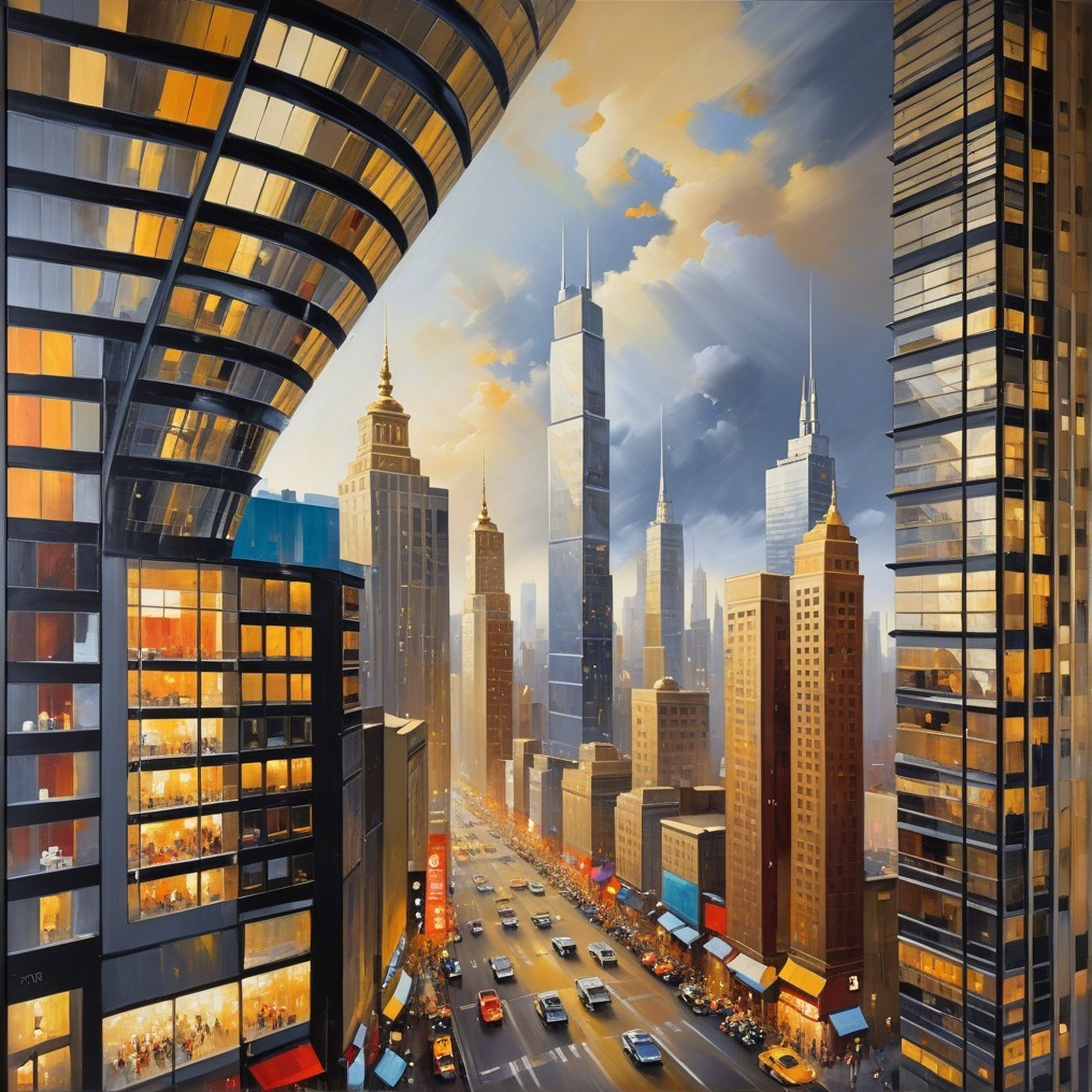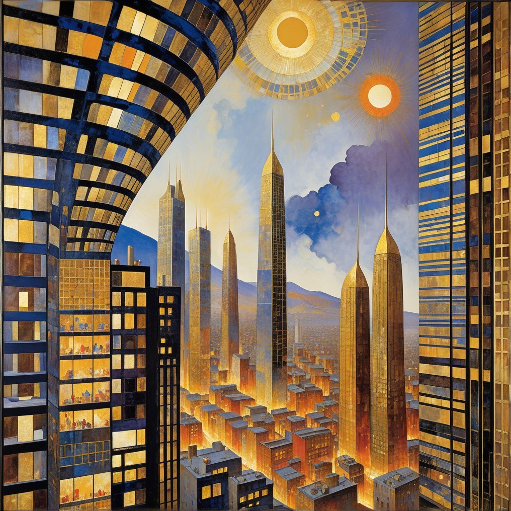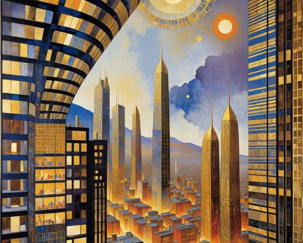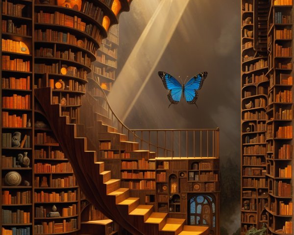 The artwork depicts a surreal, moody cityscape at night, featuring twisting staircases, unique architectural structures, and a large moon illuminating the clouds above, creating a dreamlike atmosphere.