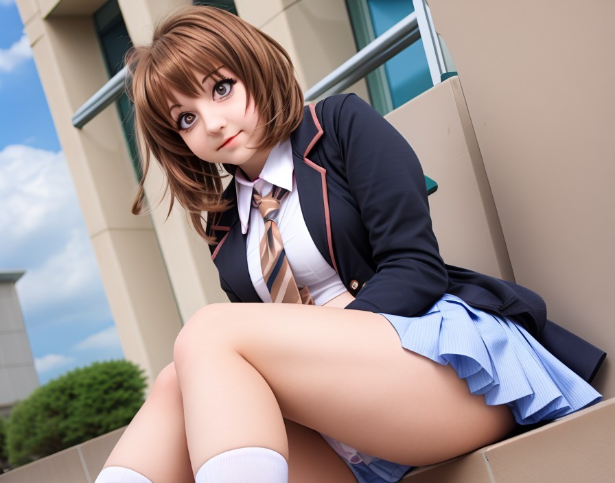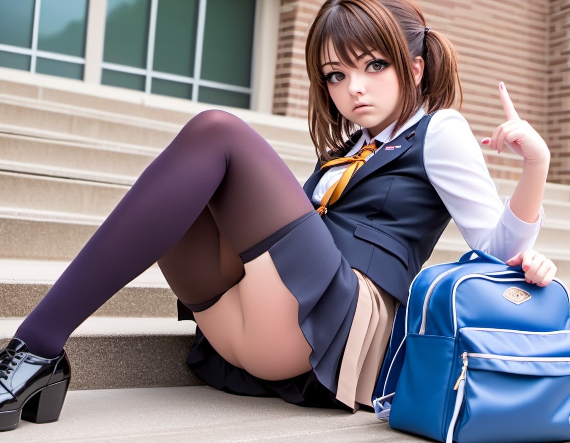 A person in a school uniform cosplay with a pensive expression is sitting on steps, looking at the camera.