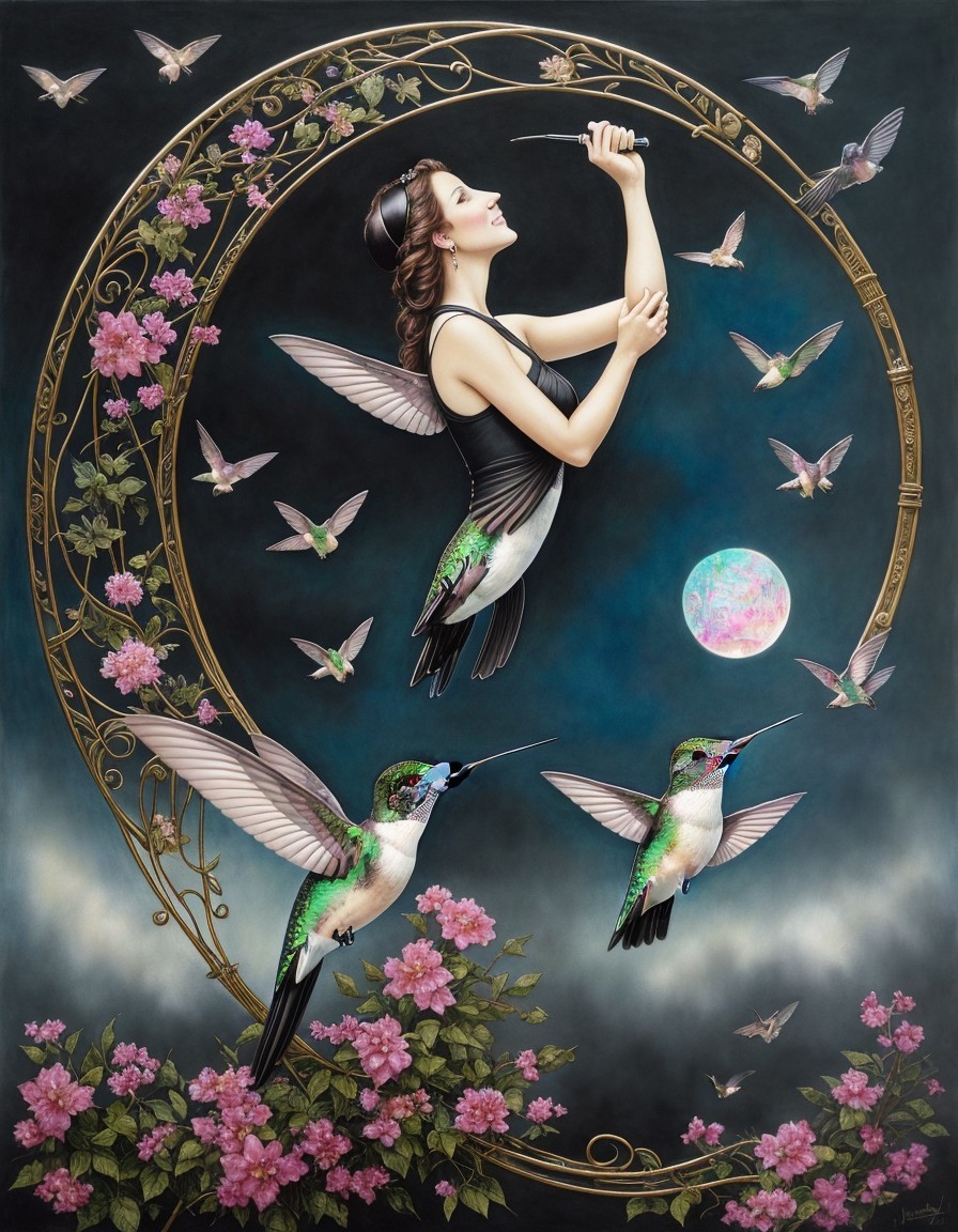 A woman in a straw hat surrounded by hummingbirds and flowers, with a fantastical moon and a vintage aesthetic.