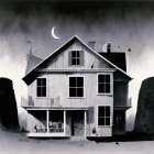 A stark black-and-white depiction of a two-story house with a covered porch, set against a night sky featuring a crescent moon and starry backdrop, evoking a sense of quiet solitude.