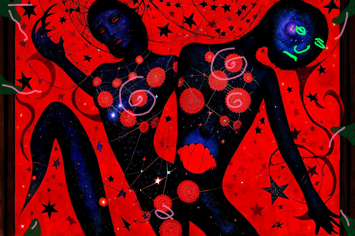 + Prompt:silhouettes of witches with stars in their bodies, cosmic backgrounds, Patchwork by Meghan Duncanson and Jennifer Lommers and Didier Lourenço. Horns. Eye.