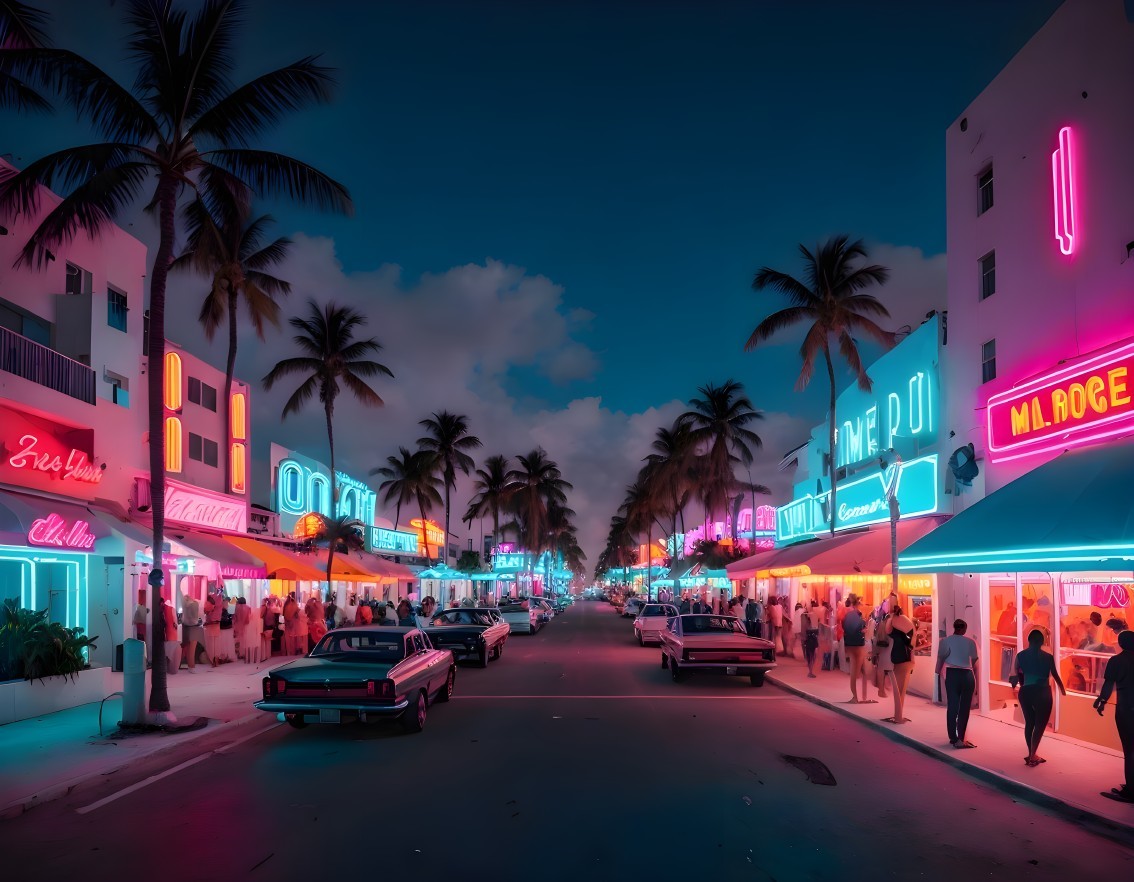 Vintage cars parked on neon-lit street at dusk by Art Deco buildings