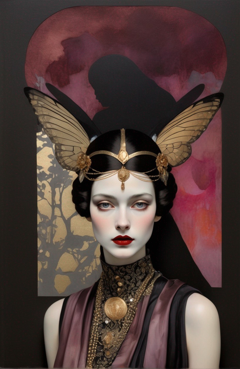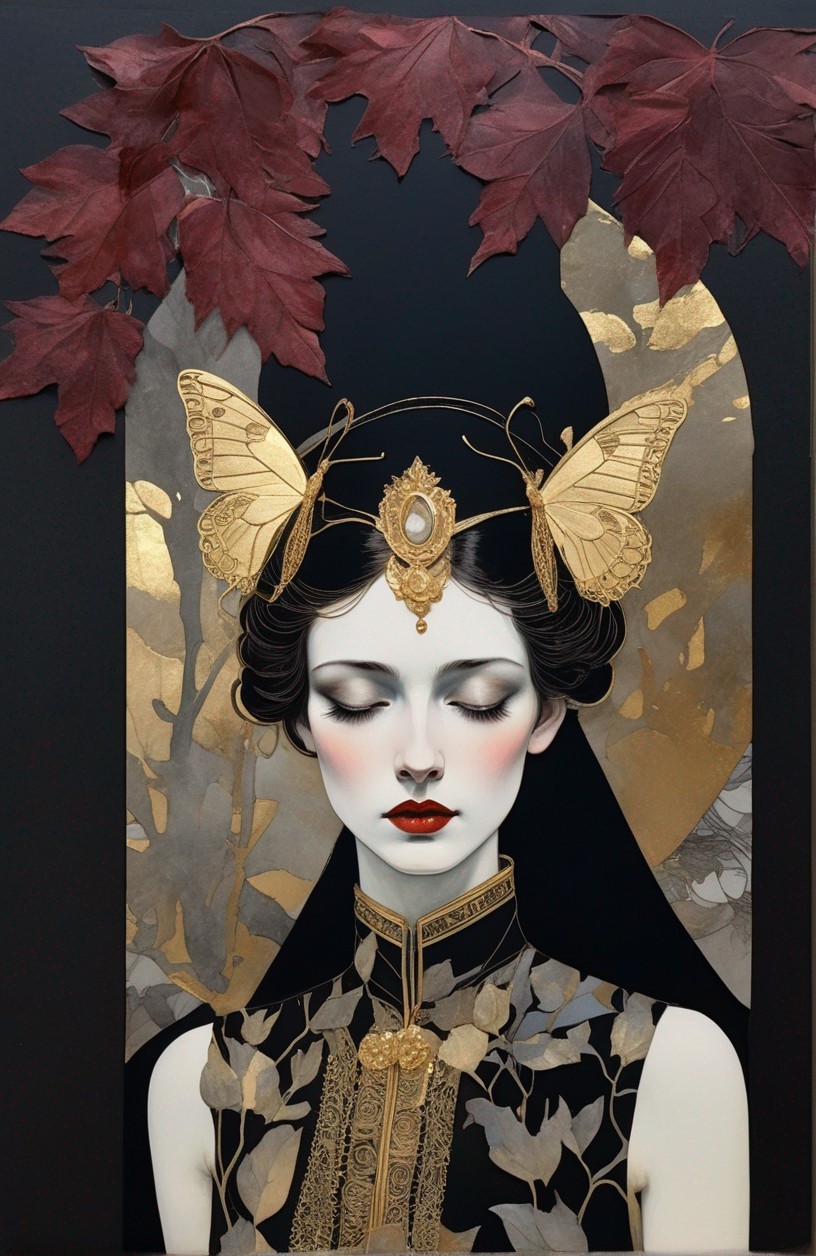 Pale Woman with Black Hair and Gold Leaves Illustration