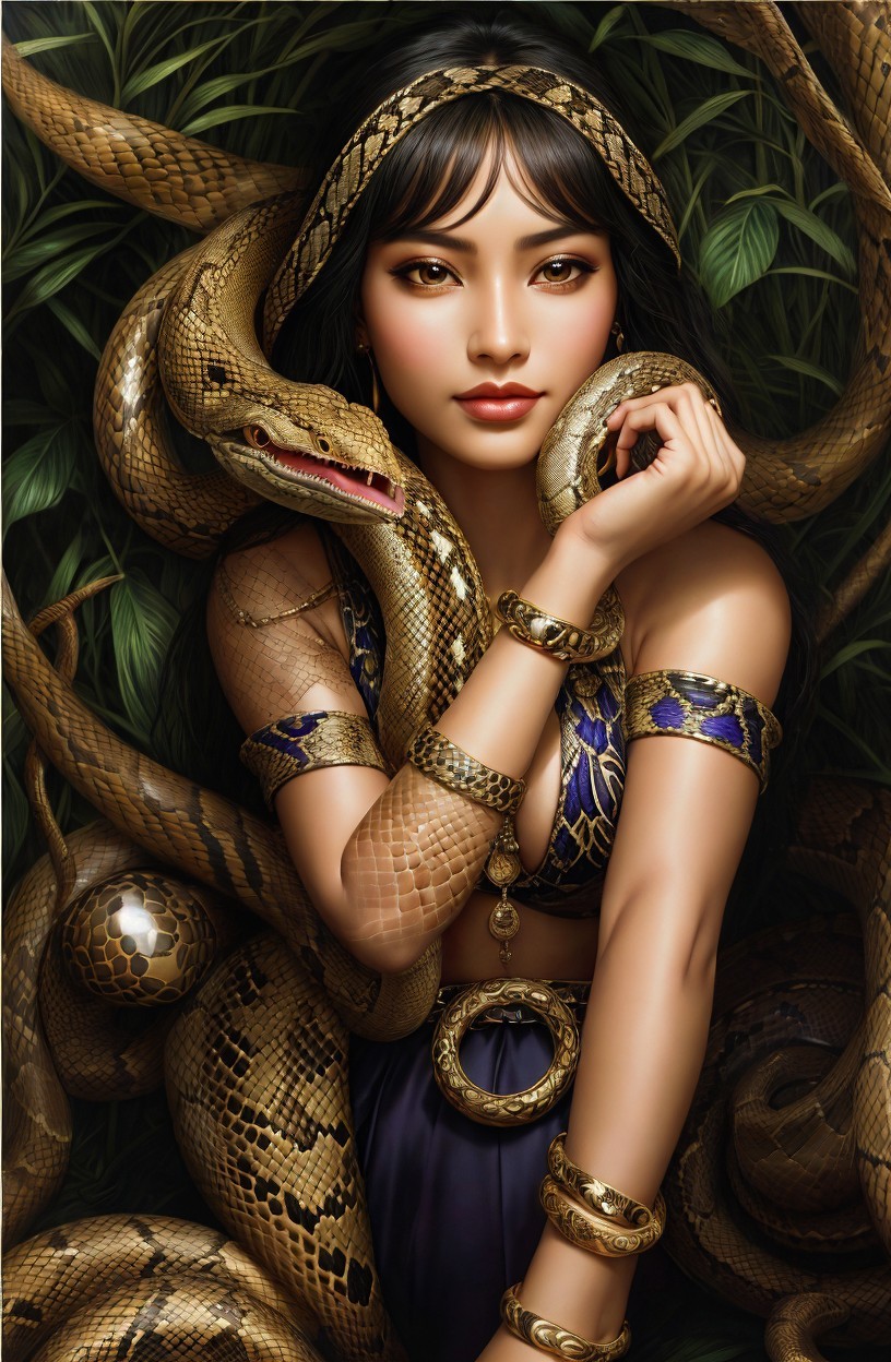 A woman in exotic attire sits with a large snake, embodying a mystical aura next to ornate architectural details.
