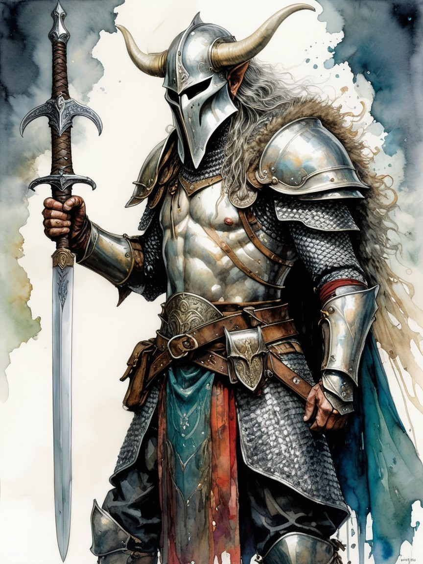A formidable warrior clad in ornate silver armor, adorned with a flowing cloak and horned helmet, stands confidently with a gleaming sword, set against a backdrop of ethereal, colorful splashes.
