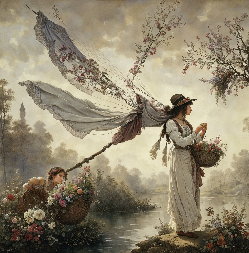 . Gypsy lady collecting herbs in basket , colored ink drawing, watercolor artwork on old withered paper, vintage, by Caravaggio, Fragonard, Anton Pieck, pale colors, high detail, intricately detailed, hyperdetailed volumetric lighting, art nouveau graphic steampunk ., whimsical, beautiful, poignant, touching. colors blush bronze, black. soft watercolor extra water in magical realism by Annigoni, Egon Schiele, Milo Manara, Botticelli, Catrin Welz-Stein, Jean Metzinger, Klimt, perfect eyes, perfect handsface, highly detailed, complementary colors, hyper detailed. Watercolor and ink splatter, dynamic pose, dark blue background, unreal engine, alphonse mucha, global illumination, detailed and intricate environment Beautiful woman in the style of Pino Daeni Dorota Piotrowiak Edward Gorey, junji ito, klimnt , gold leaf color, silver leaf color beautiful dynamic lighting high definition hdr * Random prompt award winning Max Ernst ultra detailed 4K 3D Texture