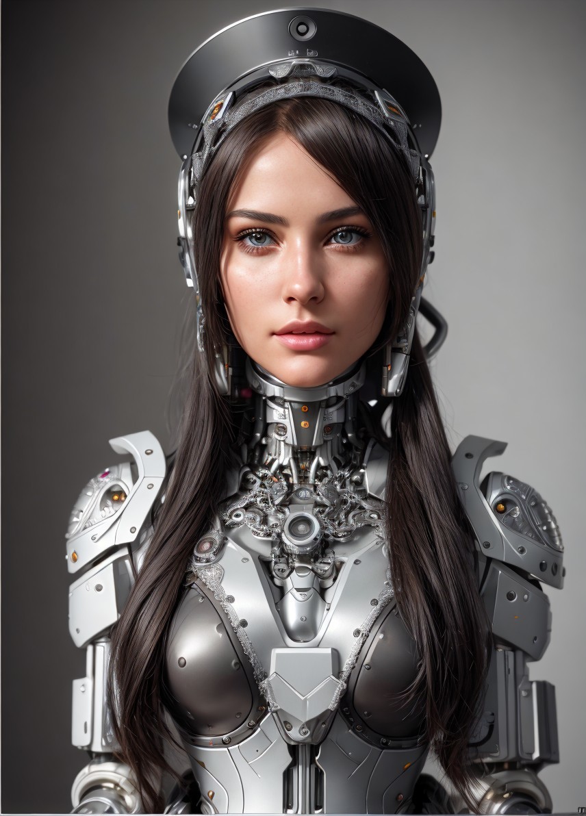 A humanoid robot with a realistic female face, mechanical body, and intricate headgear against a grey backdrop.