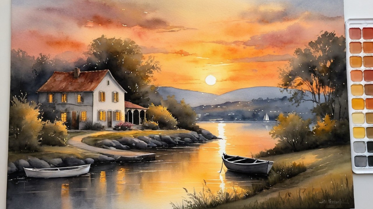 A serene watercolor landscape features a cozy house by a calm lake at sunset. Warm hues reflect off the water, with boats gently floating and distant hills adding to the tranquil scene.