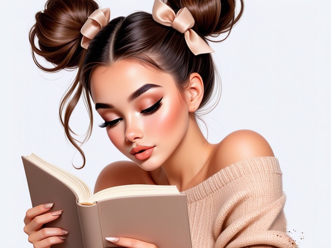 beautiful lush 2d digital illustration of a pretty girl, long fluffy black lashes, full peach colored glossy lips, rosy cheeks, tan glitter eyeshadow, perfect brows, reading a book, wearing an off the shoulder comfy light beige sweater, her hair is swept up in a casual neat bun on top of her head and a beautiful silk bow in light bight at the top, soft wisps of hair on her forehead frame her face