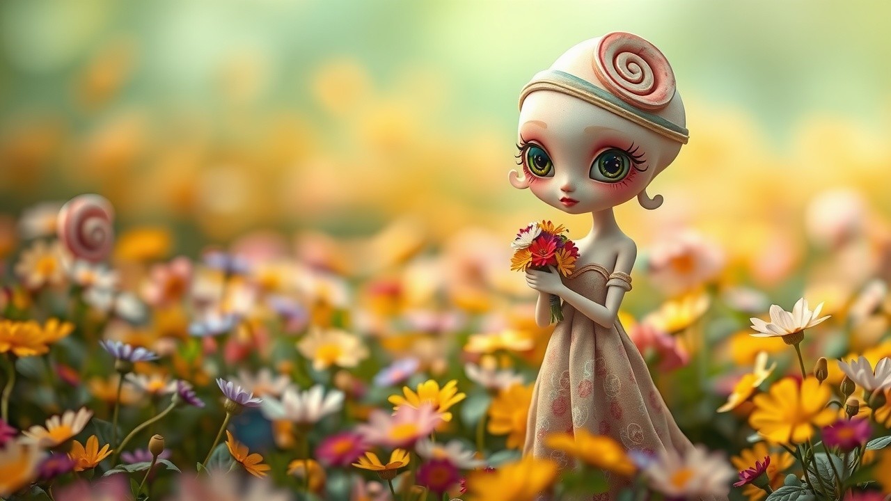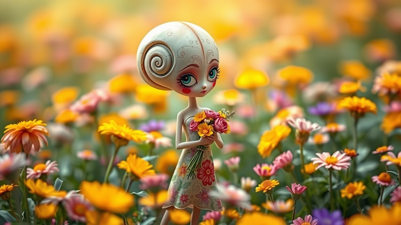 In a vibrant flower field, a humanoid character with a shell-like elongated head and swirling eyes stands gracefully. Clad in a flowing, nature-inspired dress, it holds a bouquet amidst blooming flowers, creating an enchanting scene.