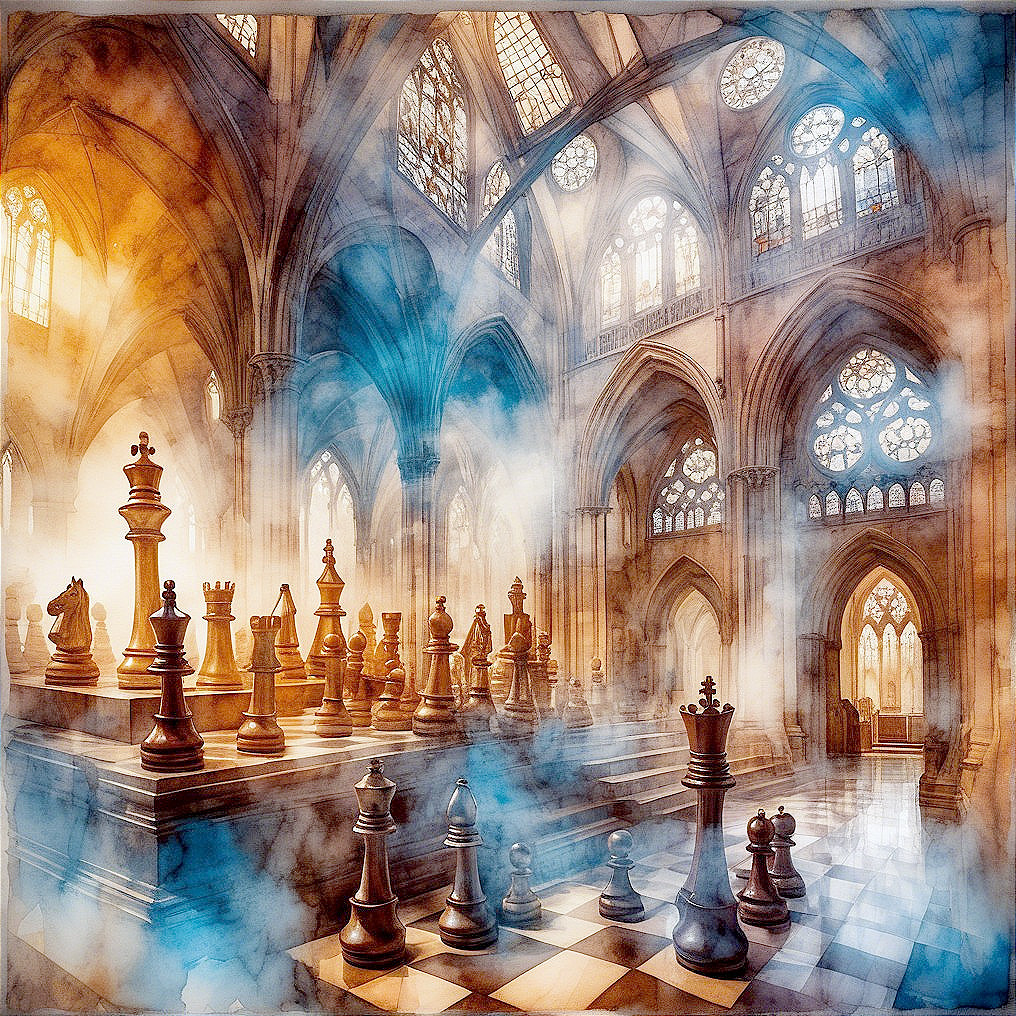 A grand, mystical chess set is positioned in a cathedral-like hall, illuminated by stained glass windows. Soft fog envelops the scene, enhancing the majestic atmosphere of the setting.