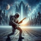 An astronaut plays an electric guitar in a futuristic setting, surrounded by vibrant planets and towering skyscrapers. The scene blends space exploration with rock music, creating a captivating vibe.
