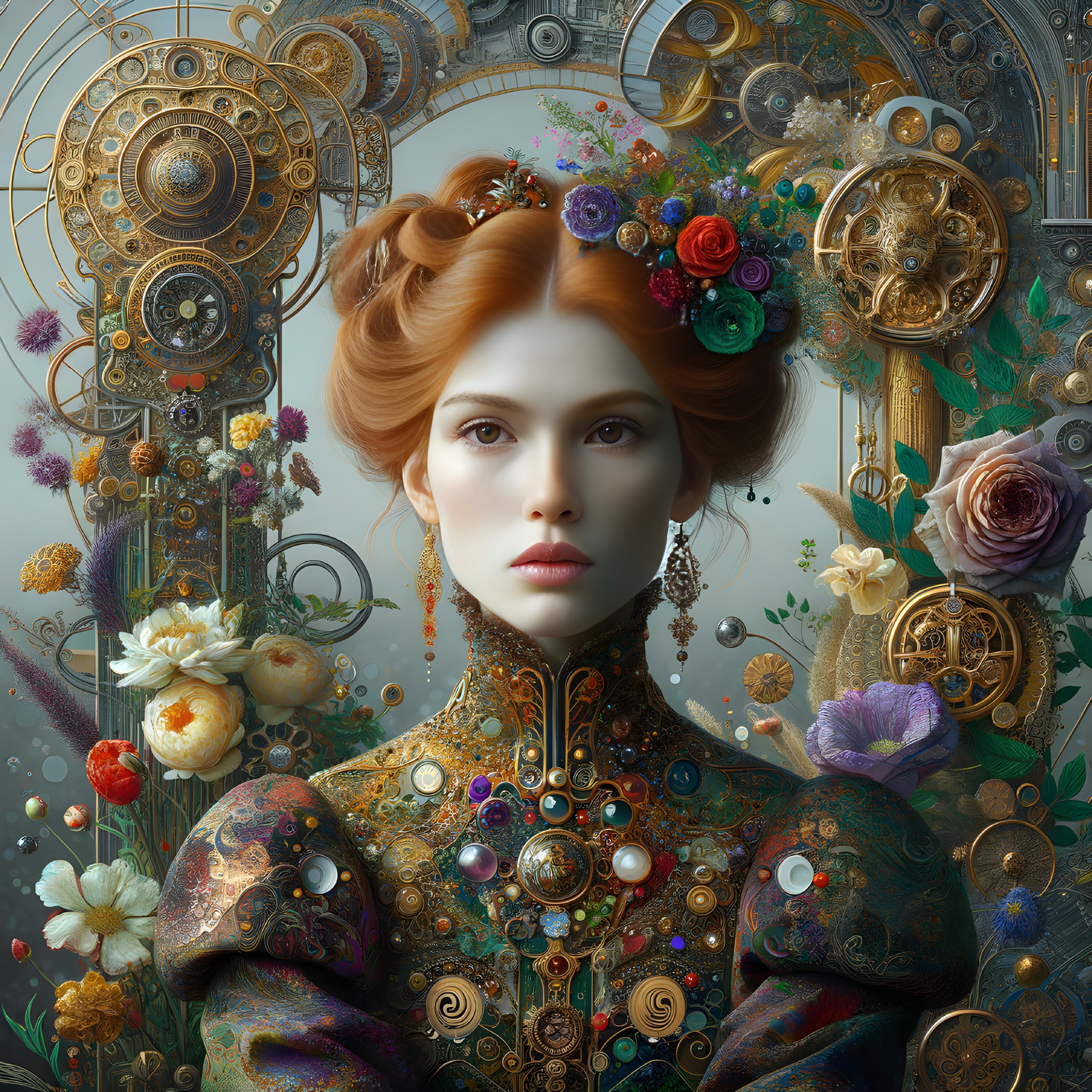 A breathtaking artwork featuring a stunning red-haired woman in a Klimt-inspired outfit, surrounded by intricate details like flowers, with a steampunk background. The piece showcases vibrant colors and fine details in high-resolution, creating a mesmerizing and detailed masterpiece.