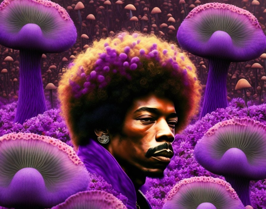 Man with afro in purple jacket surrounded by large purple mushrooms in fantasy scene