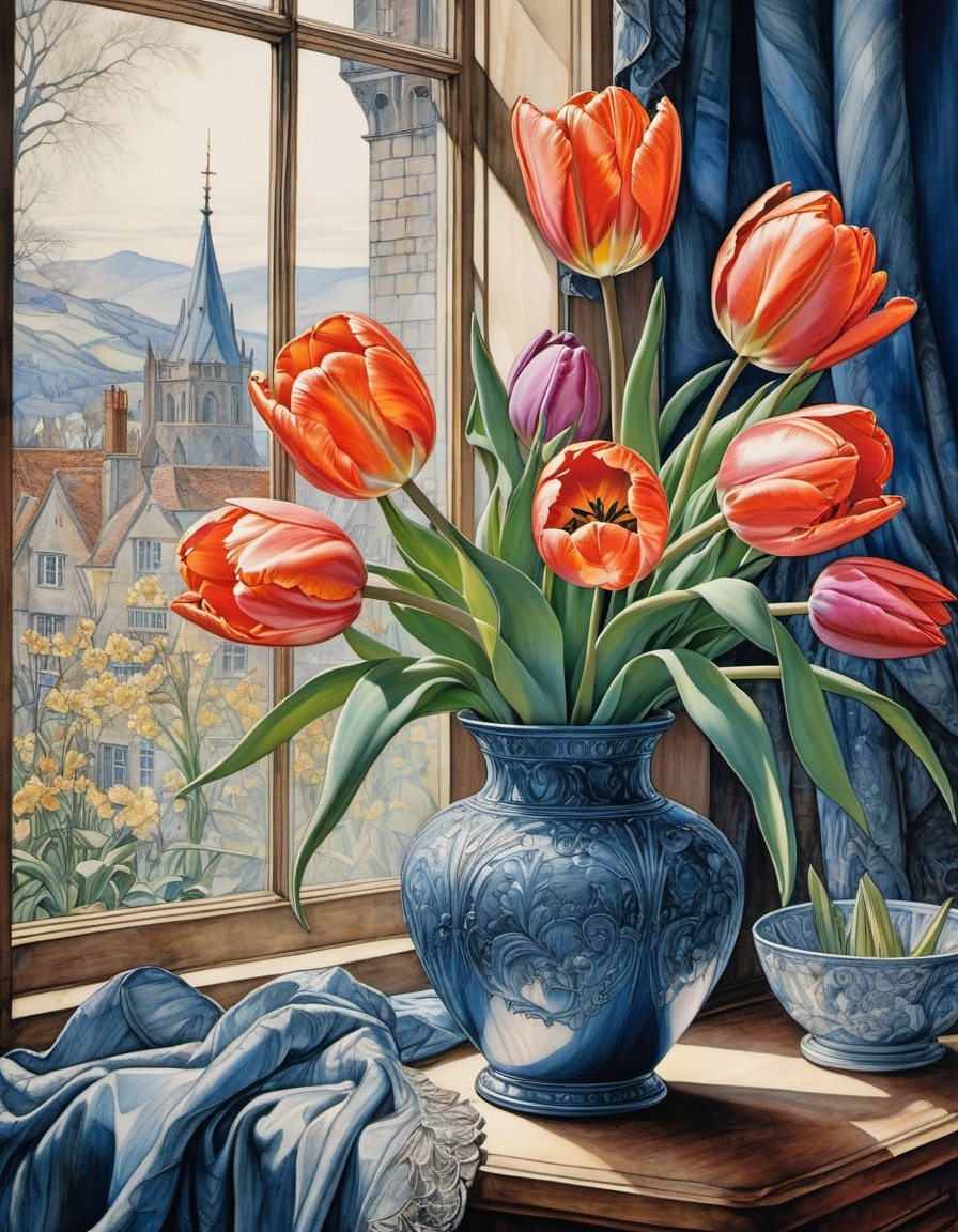 Beautiful tulips in a blue vase, near the window,