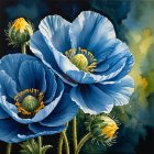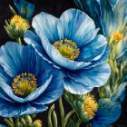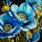 A close-up of vibrant blue flowers with intricate petals and golden-yellow centers. The flowers are lush and detailed, showcasing a beautiful contrast of colors in a botanical display.