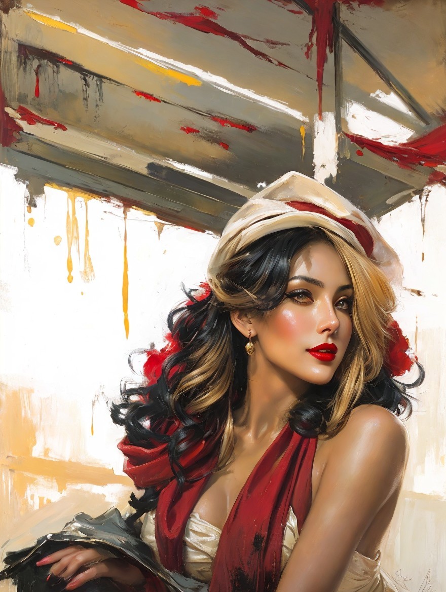 Henry Asencio, Repin, Robert McGinnis of an Impasto oil painting, heavy strokes, palette knife, rich deep colors, a beautiful , very attractive , sexy , seductive , sensual looking French girl, short black curls, red beret, tan, shining eyes, makeup, red lipstick, tenderness, smile, joy, happiness, detailing, red scarf, black and White sweater, color shades. Vivid colors, Bright colors, bold outlines, perspective, light and shadow, anatomically correct,