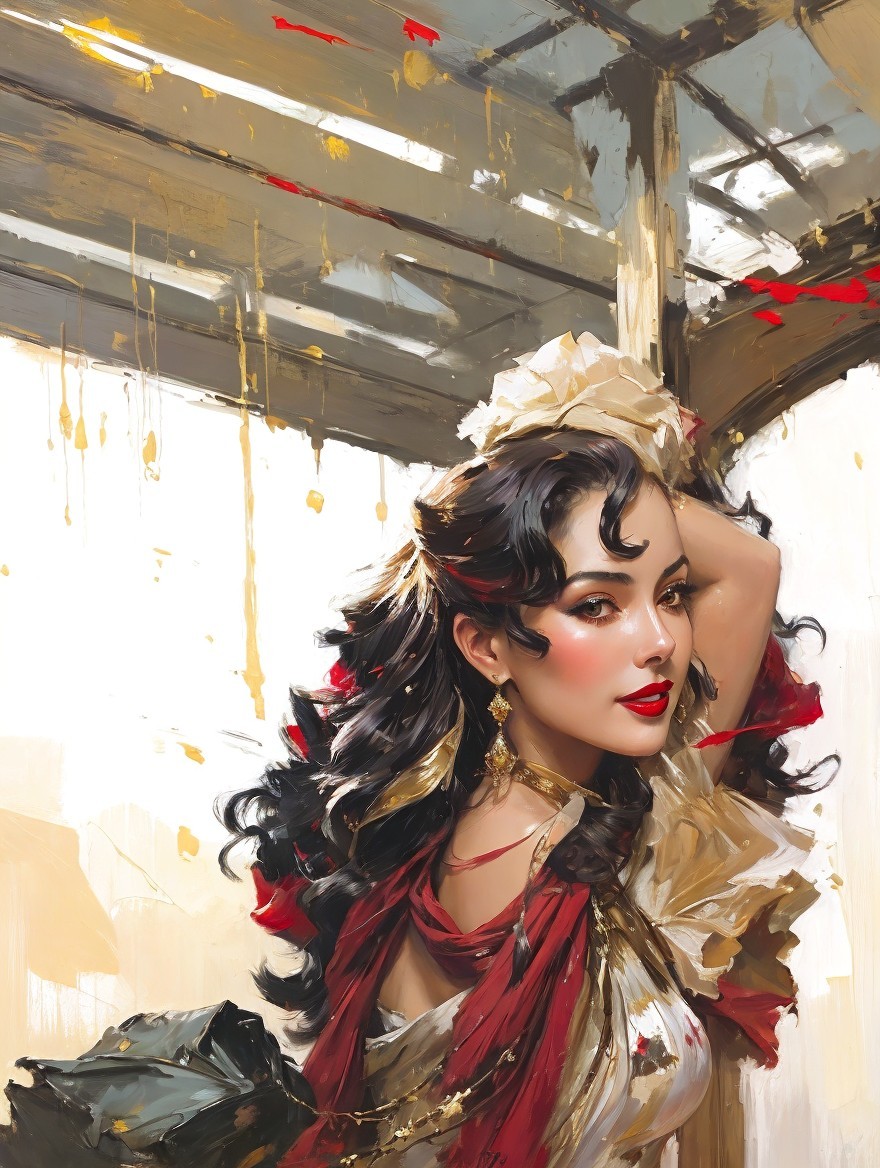 Henry Asencio, Repin, Robert McGinnis of an Impasto oil painting, heavy strokes, palette knife, rich deep colors, a beautiful , very attractive , sexy , seductive , sensual looking French girl, short black curls, red beret, tan, shining eyes, makeup, red lipstick, tenderness, smile, joy, happiness, detailing, red scarf, black sweater, color shades. Vivid colors, Bright colors, bold outlines, perspective, light and shadow, anatomically correct,