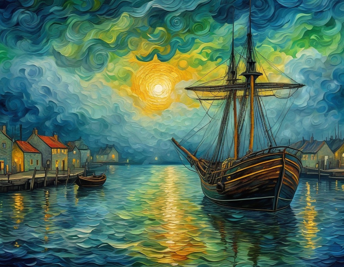 An award-winning, highly detailed 4K 3D painting featuring a stormy harbor scene with vibrant warm and complementary colors, intricate gold lines, and stunning color depth in a fantasy style.