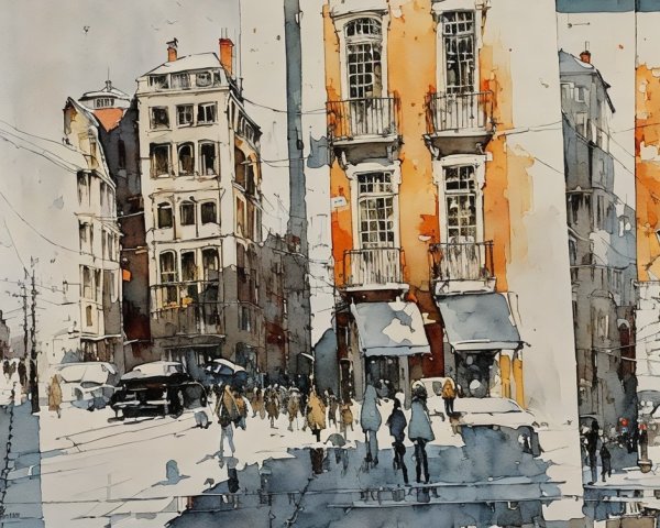 A bustling street scene at dusk, featuring elegant storefronts and people in stylish attire. Warm lamplight casts a glow, creating a cozy atmosphere amidst the urban setting.