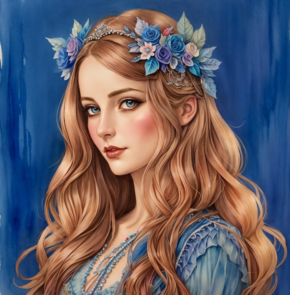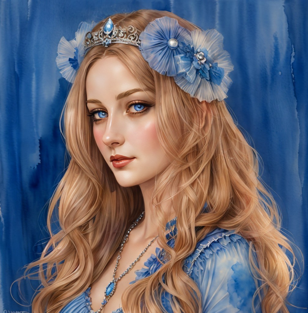 Watercolor and ink portraiture, beautiful female enchantress in front of blue wall, edwardian, coronet, frilly dress, upper body portraiture in watercolor and ink, quilling, tints of comical sketch art by Overton Loyd, detailed nose, realistic devilish eyes, dynamic lighting 1.7, wavery paint , high contrast, High coloring, detailed close-up portrait, stylized face, watery alcoholic painture and ink, dots and flares and splashes, soft edges, back-lit, triadic color scheme blue beige red, purple lighting, brushed paint, style of paint dripping technique, wet on wet painting, 8k 3d, synthetic, plasticity 1.6, gothical, , chiaroscuro lighting, ambient occlusion 1.5, shadow mapping 1.3, 3d effects 1.8, intricate stylized hairstyle, brightness 1.7, stylized zentangle lines, abstract, coherent, hues, eerie, occult, retropunk, creamy, sweaty, tribal, occult, Anglocore 1.9, auracore, mosscore 1.7, spheres, cottagegore 1.9, retrofuturistic details of ornate, maximalism, radiance, brightness 1.4, silver particles, dreamy glow, tints of abstract art nouveau illustration, Kinky Pop Surrealism, radiance, bioluminescent details, vivid illumination, illustration on old paper, tints of timlin, 3d effects 1.8, shadow mapping 1.3, dynamic lighting 1.7, ambient occlusion 1.5, anisotropic filtering 1.9, raytraced shadows, ethereal, otherworldly, abstract style 1.7, hues, grain, blurry aura, fantasy movie still, synthetic essence, luminosity 1.3,