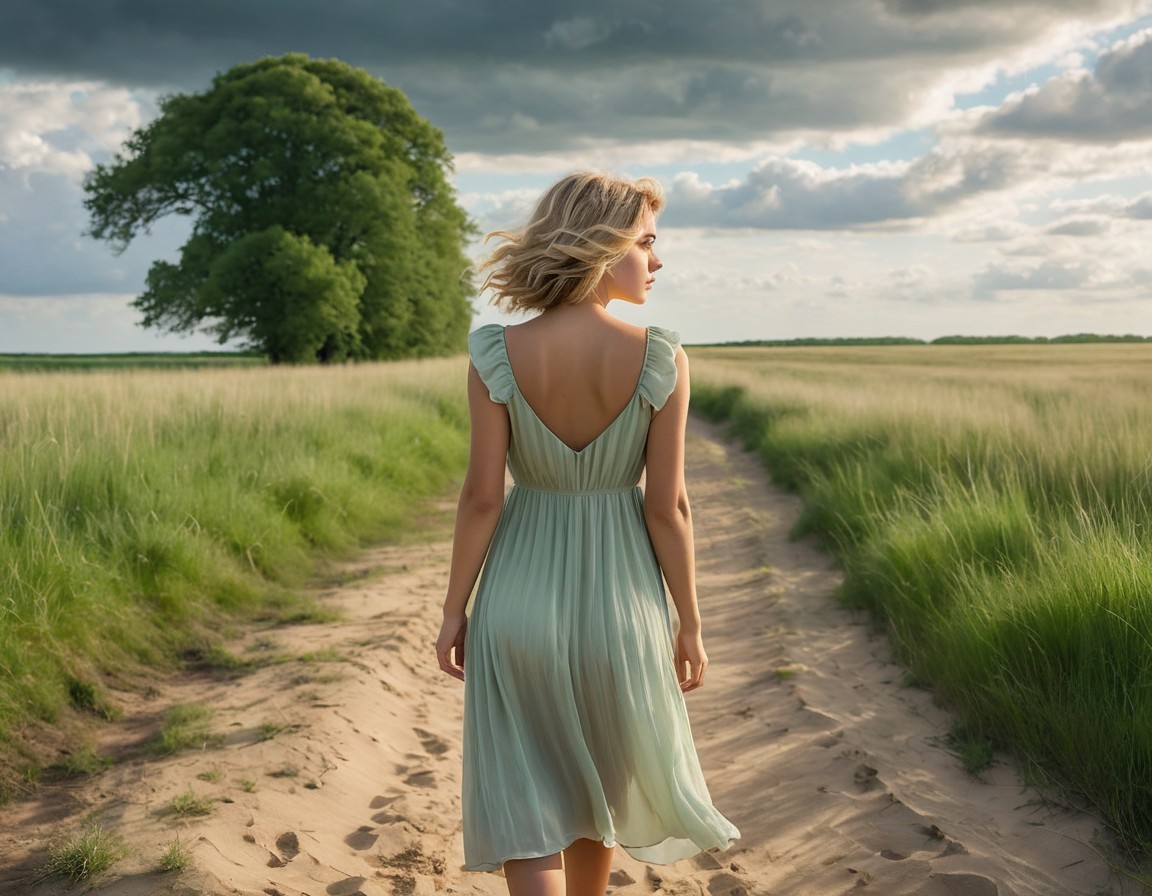 A woman in a flowing mint green dress walks along a sandy path through a lush grassy field, with a large tree and dramatic clouds in the background, evoking a sense of peaceful solitude.