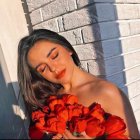 A woman poses elegantly in a striking red off-the-shoulder dress. Her long, wavy hair and bold red lipstick enhance her glamorous look, complemented by sparkling earrings and soft lighting.