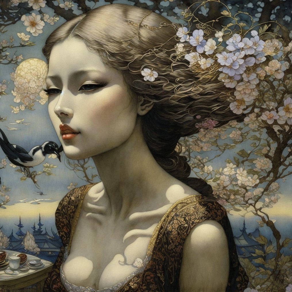 A serene woman with elegant features stands amidst blossoming flowers. Her intricate hairstyle and delicate makeup create a captivating, dreamy atmosphere that evokes a sense of tranquility.