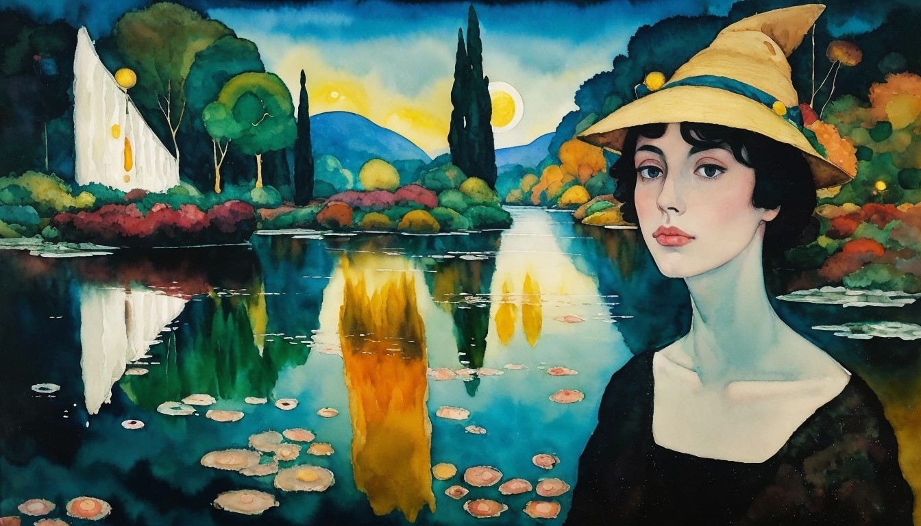 A woman in a black dress and yellow hat is superimposed on a vibrant landscape with a reflective lake, waterfalls, and lush greenery.