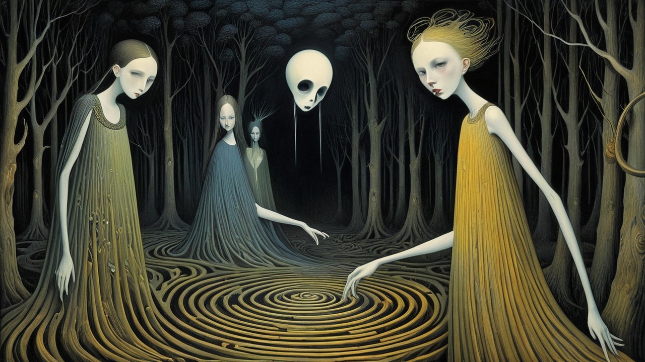 Prompt: "(( fabulous Atrapine maze fabricated surrealism quirky occult spectral mental glitch by Theodor Kittelsen & Francis Bacon & Jenny Saville {by Gris Grimly, Tim Burton and Alexander Jansson} flowing colorful morphing shapes that emphasize unlogical form and exaggerated expression, evoking a sense of surreal movement andClosest thing to art created by brilliant albeit sick mind, inspired by quirky dimensions of analog of Wojciech Siudmak - POV of :Distorted, dreamlike scene, inspired by quirky dimensions, viewed through a fisheye lens.))"