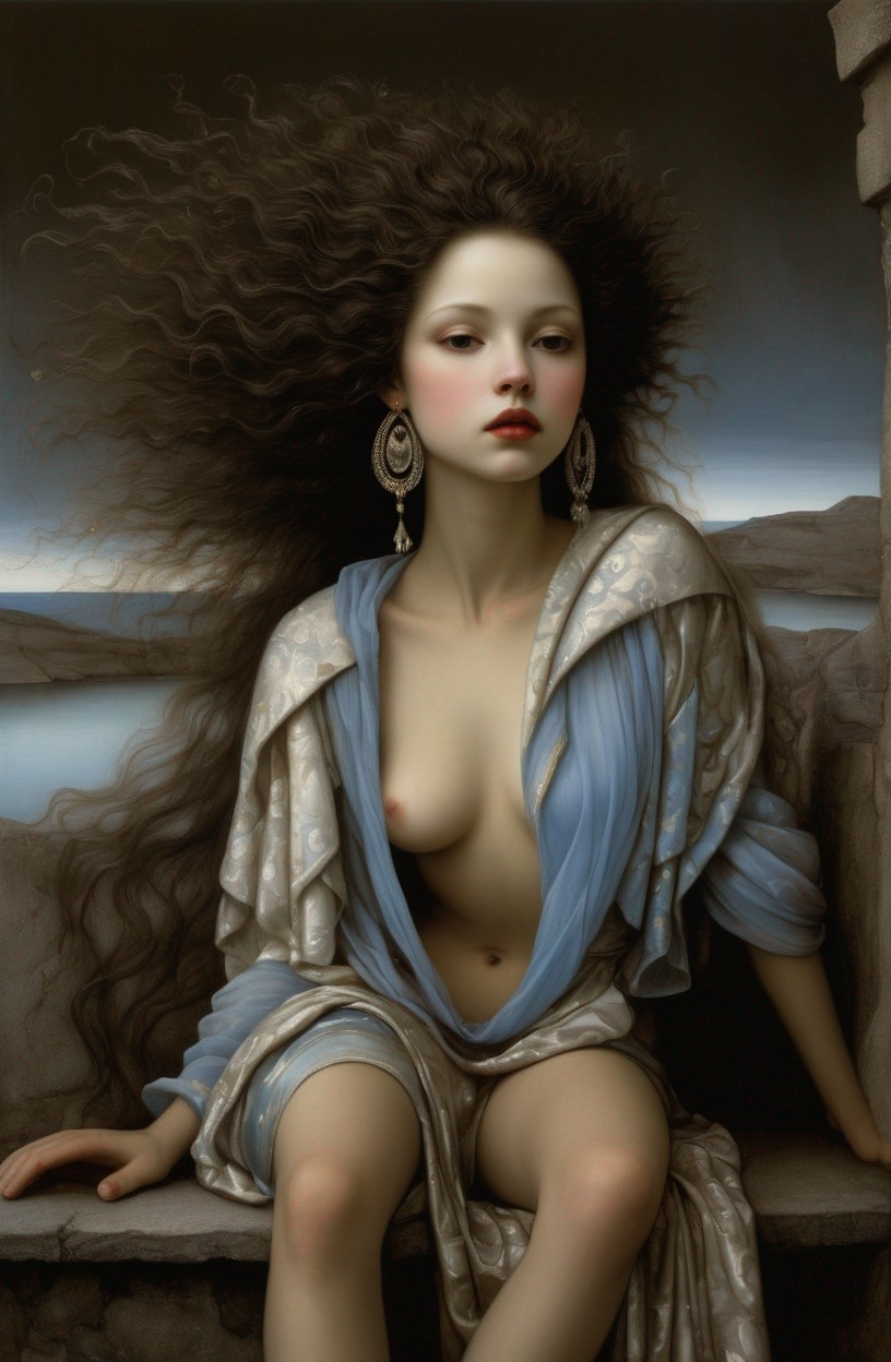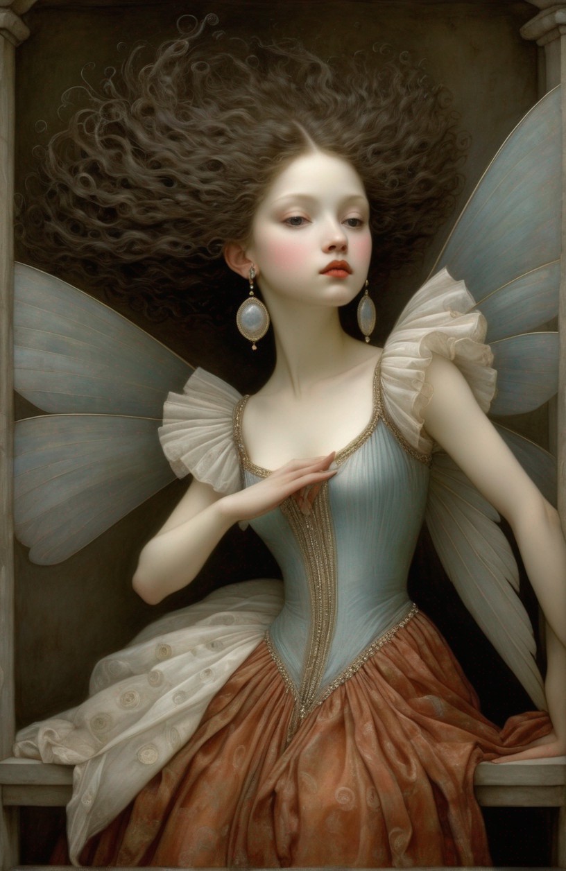 Pale ethereal female figure in ornate dress with large eyes and headdress among white flowers