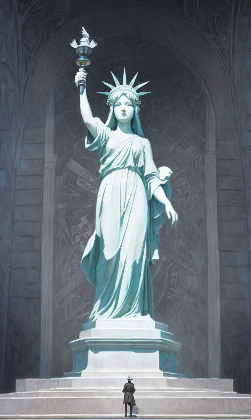 A towering statue of the Statue of Liberty is juxtaposed with a small human figure, emphasizing scale and grandeur against an ornate backdrop.