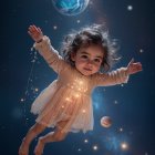 A joyful child floats amidst a starry sky, wearing a shimmering dress. She reaches out to twinkling stars and a glowing moon, radiating innocence and wonder in a magical cosmic scene.