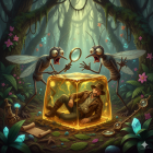 Prompt: Two anthropomorphic mosquitoes, looking astonished and as if they had just made a major scientific discovery, stared intently at a sleeping man trapped in a large block of amber in the middle of a lush jungle. The man must look like a classic adventurer. An atmosphere of prehistoric discovery and mystery.
