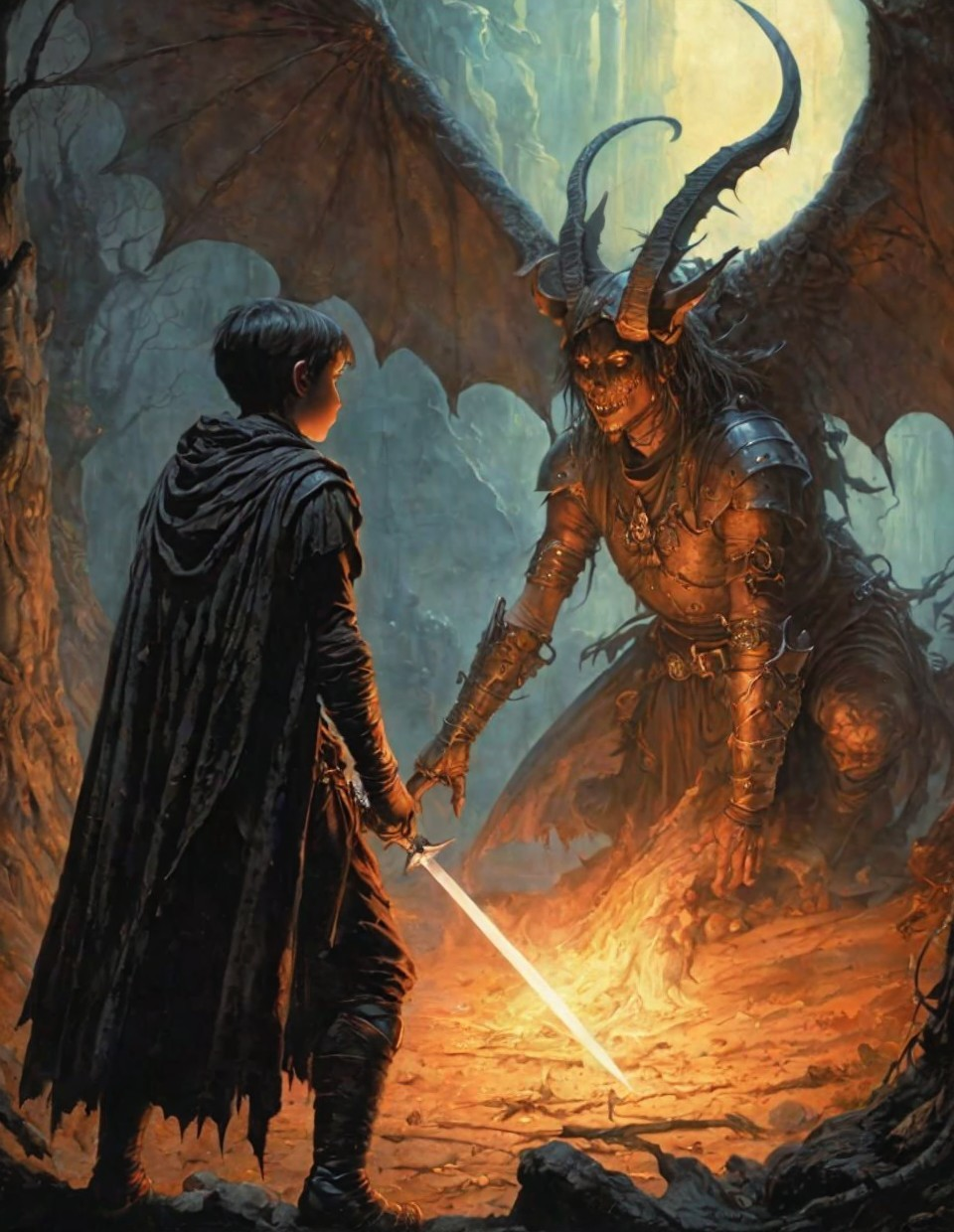 “But whatever the thing said, he refused to heed. He tightened his grip on the sword and it began to glow. …”