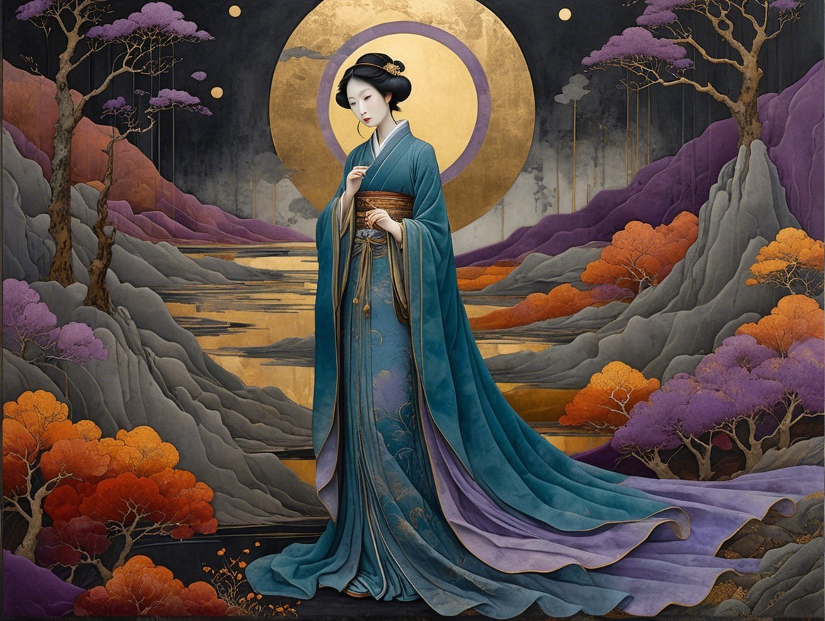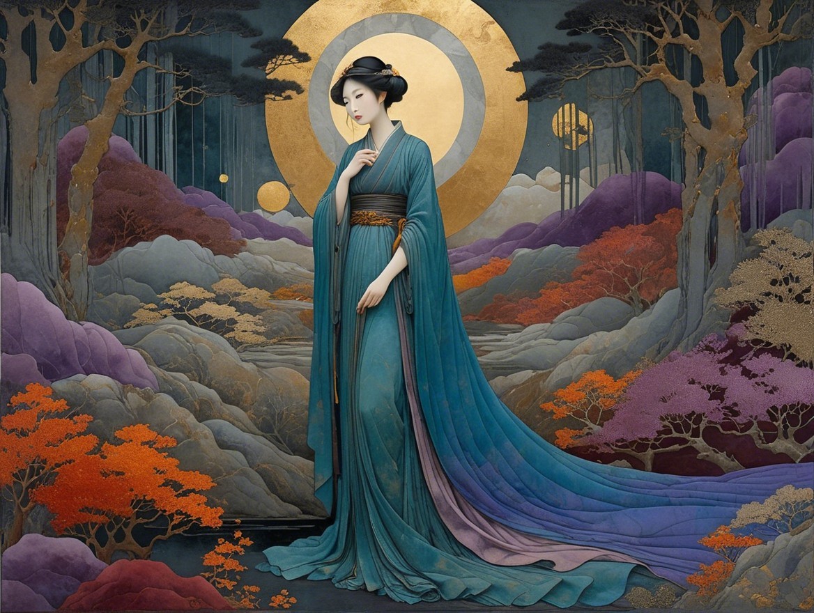 Legend of the Girl and the phantom, Medieval Japanese Artists Sumi-e Style, Velvet blush purple, Shabby, Dull Gold, Amber Gray, marbled. dramatic