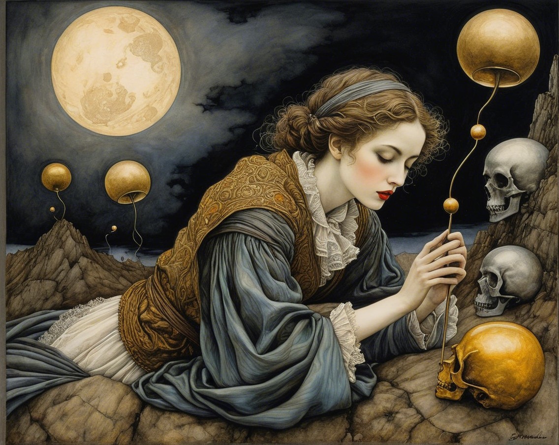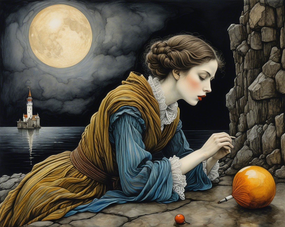 A young woman in a blue and orange dress kneels by a tree, lost in thought. A glowing orange orb rests nearby, illuminated by the soft light of a large full moon in the night sky.