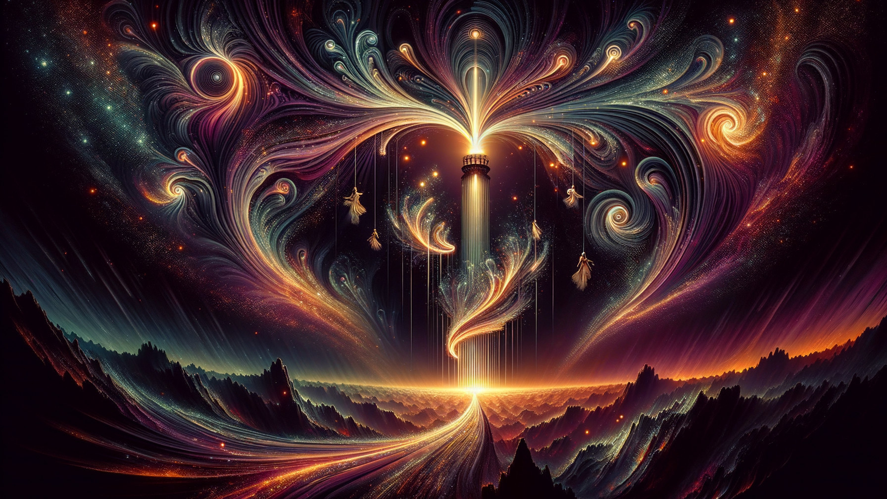 This digital art piece features a lighthouse beam transforming into flowing liquid light, cascading into a dark abyss. Exotic patterns weave within the luminous descent, set against a deep void with shimmering lights, creating an emotional journey through a vibrant, otherworldly landscape.