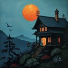 A captivating twilight scene features a charming house with glowing windows, set against a vibrant orange moon. Silhouetted mountains and birds enhance the enchanting atmosphere.