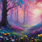 A serene forest path meanders through towering trees, surrounded by vibrant wildflowers. Soft mist hangs in the air, creating a mystical ambiance in this enchanting woodland scene.
