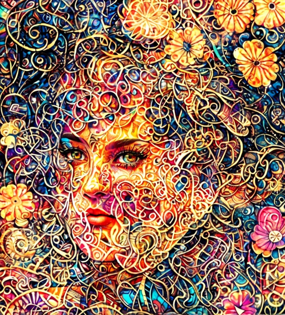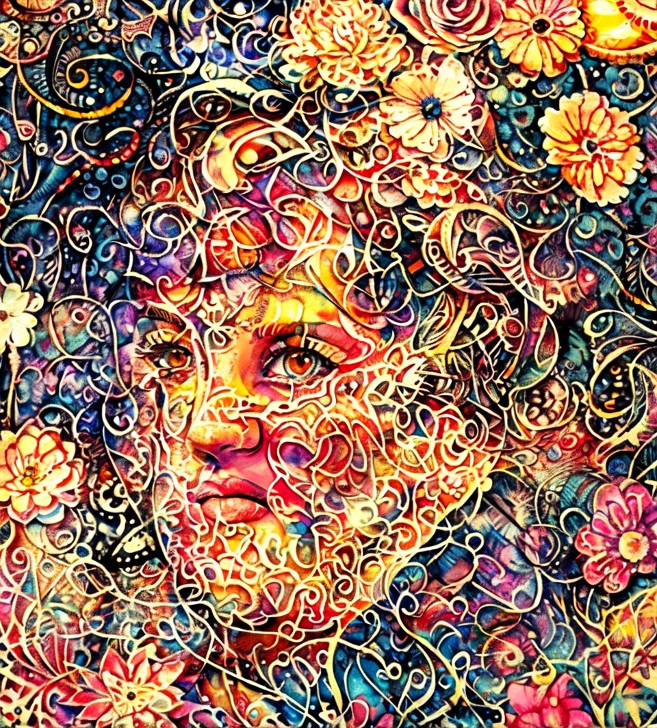 + Prompt:Speed painting portrait of teenage surrounded by zentangle lines, aquarelle style with tints of graffiti, line-art, intricate ornamental details, arranged in the style of Megan Duncanson, stylized illustration in style of Jean miro and Megan Duncanson, 3d effects 1.8, ambient occlusion 1.5, anisotropic filtering 1.7, raytraced shadows 1.8, sublime, triaduc color scheme yellow red amber, comical, high coloring, eldritch, dark, raytraced shadows 1.8, sublime, cottagegore 1.9, retrofuturistic, atmospheric, coherent, synthetic, stylized illustration, kinetic dripping art intertwined with pointilism and inkpunk 1.8, depth of field 1.7, maximalism, illustrative, chaotic, high coloring 1.9